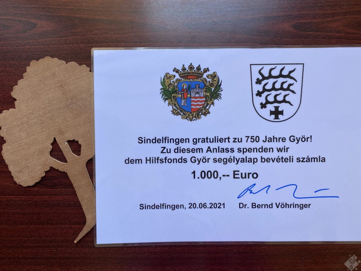 A gesztus viszonzásaként most Sindelfingen főpolgármestere, dr. Bernd Vöhringer is fát adományoz Győrnek a város 750. évfordulója alkalmából, valamint ezen felül 1000 euróval támogatja a Győri Segélyalapot, amelynek célja a koronavírus elleni küzdelem segítése, illetve a koronavírus által okozott károk mérséklése.