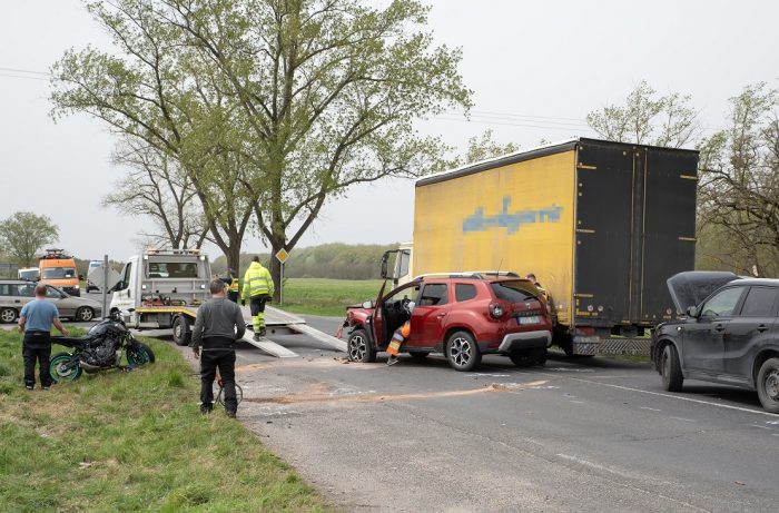 A Katasztrófavédelem információi szerint több személyautó, két motorkerékpár és egy tehergépkocsi ütközött össze a 116. és a 117. kilométer között.