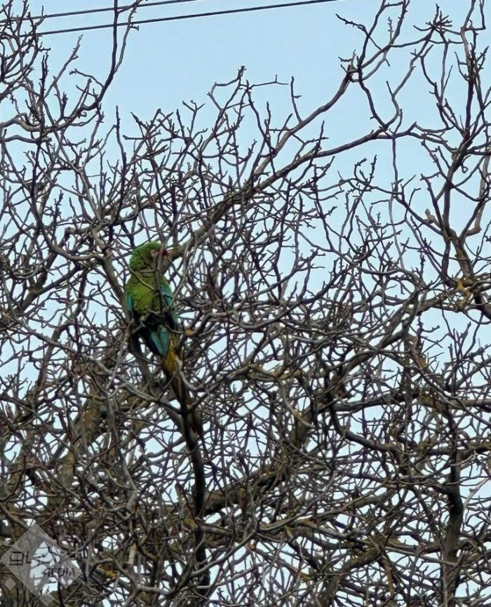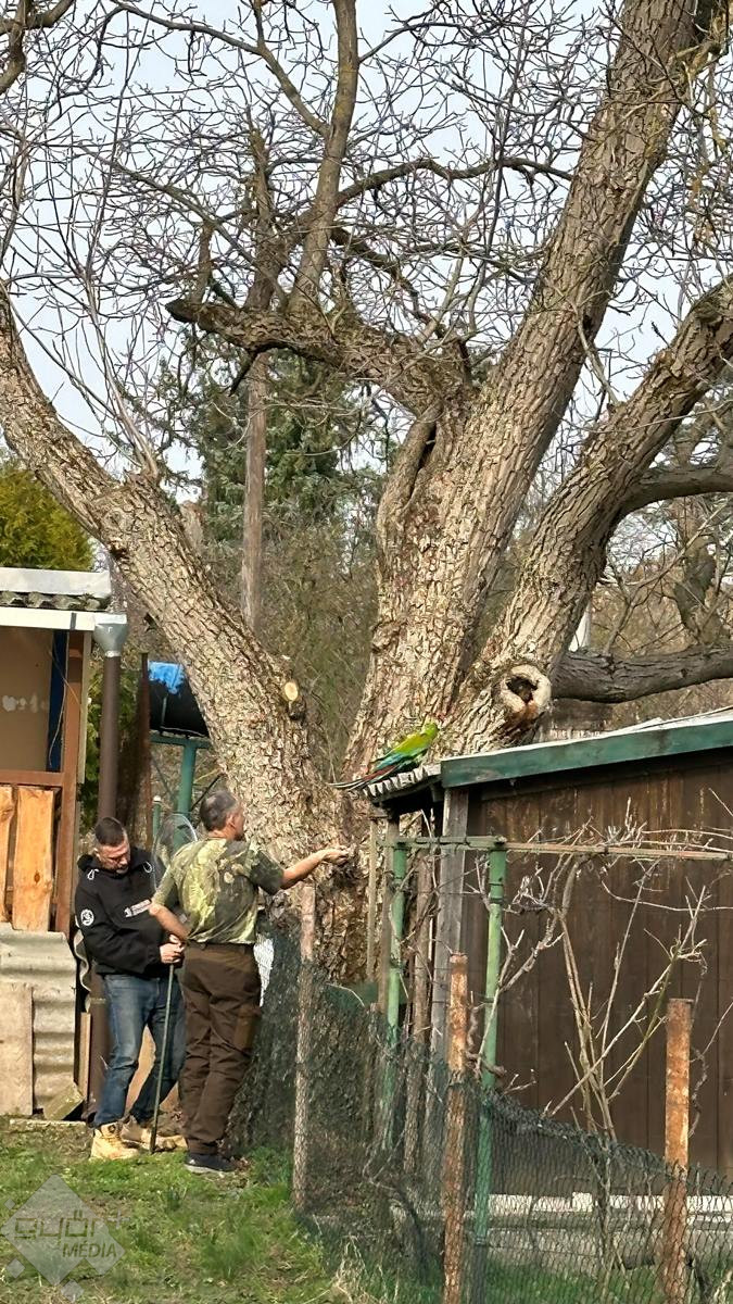 „A fa, amin végül megpillantottuk, egy zárt udvarban volt. Balázs Csabával, a Papagájmentő Alapítvány szakmai vezetőjével átugrottuk a kerítést, mert látszott, hogy vagy most fogjuk meg, vagy megint elveszítjük. Szerencsére abban a kertben pont nem volt kutya. Csaba a kezében egy maréknyi diót csörgetett, én meg egy befogó hálóval álltam készenlétben, hátha kell, ha úgy alakul. Csaba egyébként 25 éve foglalkozik papagájtenyésztéssel, tehát igazi szakértője ezeknek a madaraknak. Vera és Gunics Zoli a Természetvédelmi Őrszolgálattól kintről figyeltek, mert akkor tényleg azon múlt minden, hogy Csaba le tudja-e csalogatni a gyönyörű madarat.