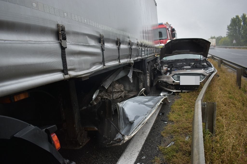 A vétlen Ford a szalagkorlát és a kamion közé szorult. Fotó: police.hu