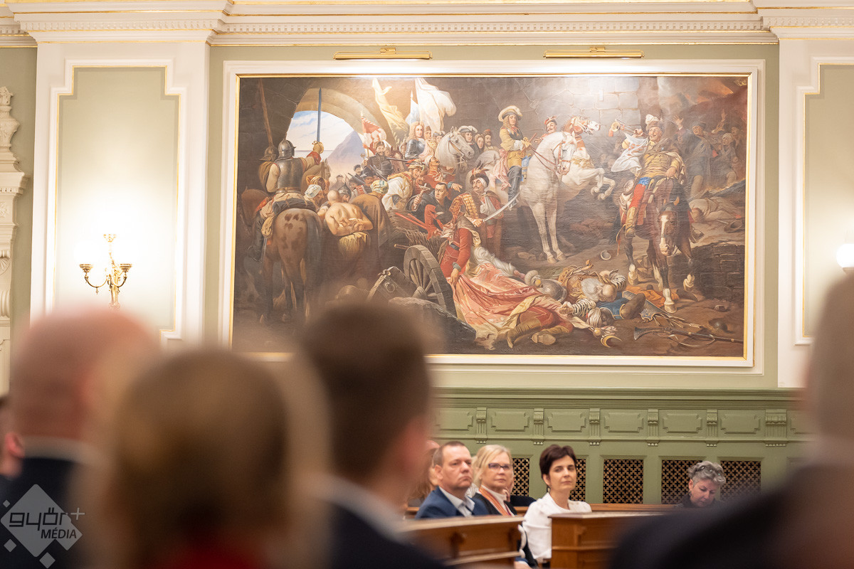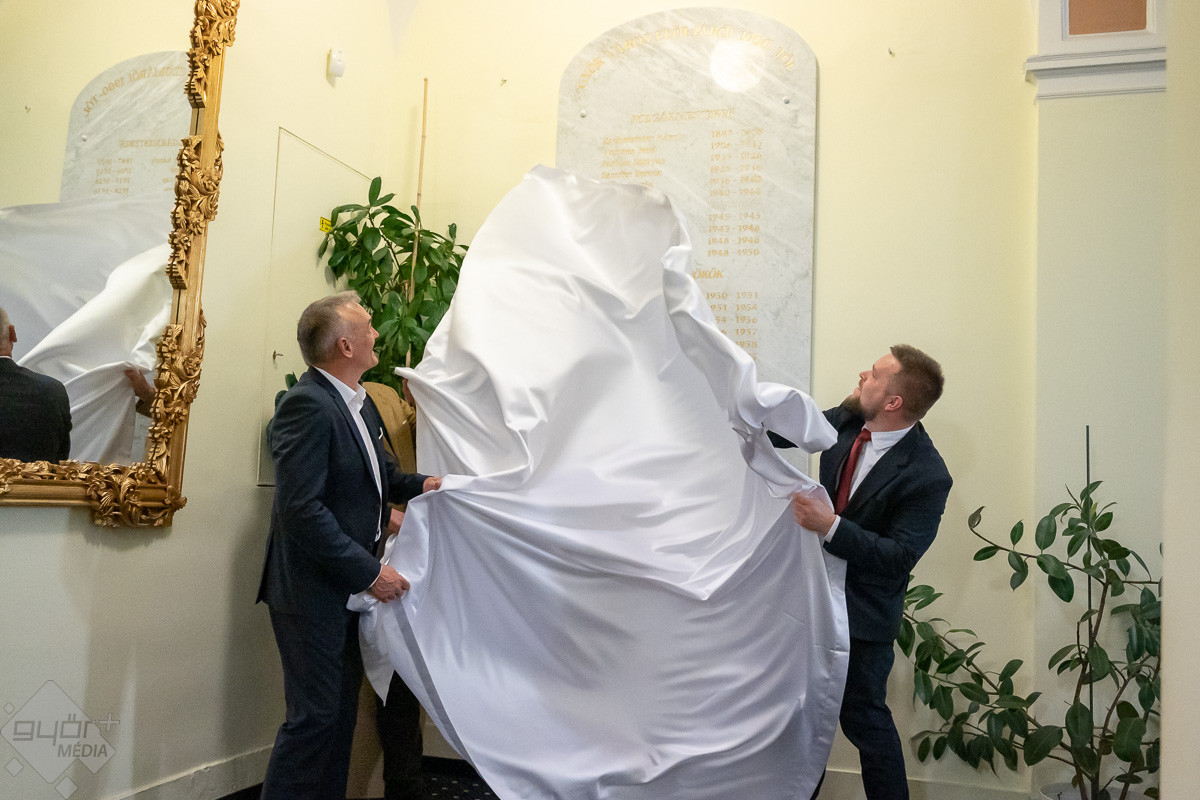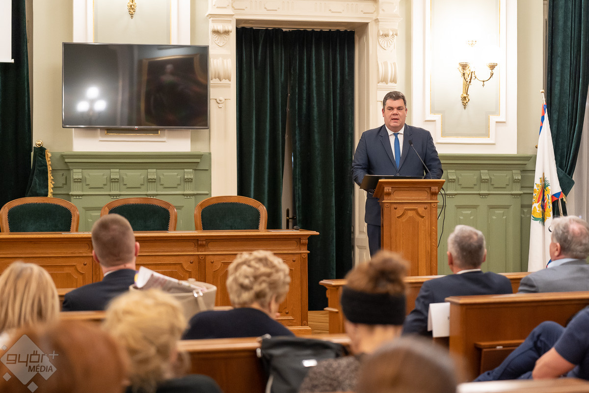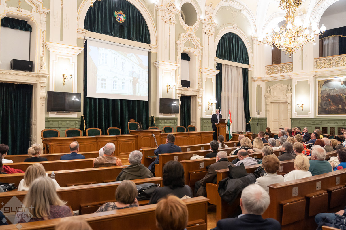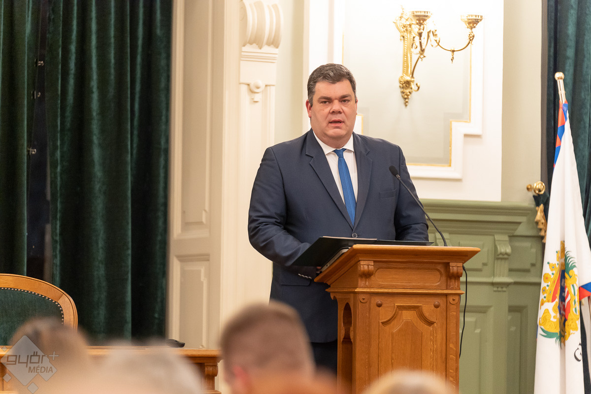 Köszöntő beszédében Pintér Bence polgármester elmondta: A Városháza egyszerre jelképe a tradíció tiszteletének és az innovációra, az újra nyitott, átalakulóban lévő városi közösség tenni akarásának. Győr nagy változásokon ment át 19-20. század fordulóján, amikor 1870 és 1920 között kereskedővárosból iparvárossá alakult. A vasút megjelenésével az egykori gabonaraktárak helyét gyárak vették át, lakossága megkétszereződött és az ország második legfontosabb ipari székhelyévé nőtte ki magát. Ekkor merült fel az igény a helyi közigazgatás új központjára, amit a vasút mellett, a város akkori szélén építették meg. A munkát helyi építőmesterek végezték el hat év alatt.