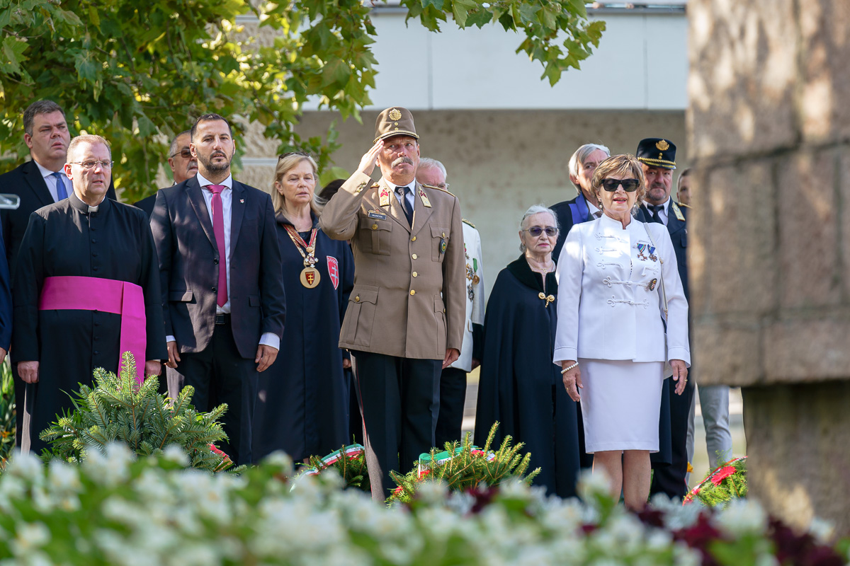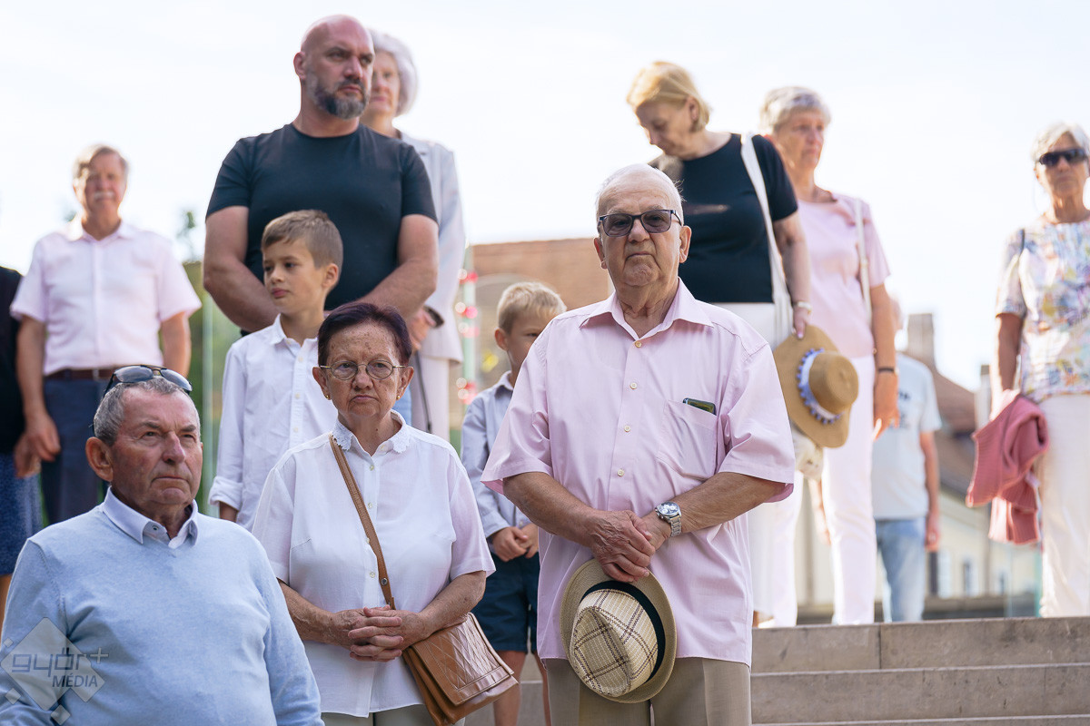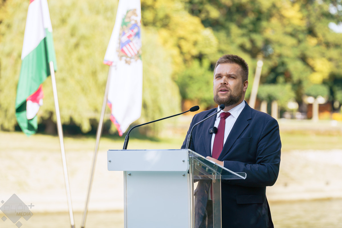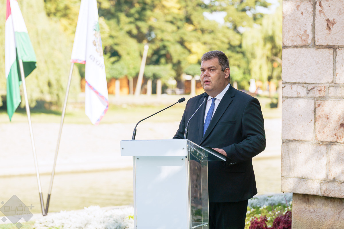 Pintér Bence (Tiszta Szívvel a Városért Egyesület), Győr polgármestere ünnepi beszédében felidézte a magyarság, Magyarország történelmét. Azt hogy több mint ezer éve érkeztek a magyarok a Kárpát-medencébe, majd az ezt követő évszázadokban a Magyar Királyság virágzott, európai szövetségesekben erősödött, és túlélte a külső támadásokat. Vörösmarty Mihály szavaival: „Megfogyva bár, de törve nem, él nemzet e hazán.” Mint felelevenítette: a 19. században, bár Habsburg uralom alatt, de Magyarország gazdaságilag és társadalmilag is fejlődésnek indult. Vasutak épültek, a polgárság megerősödött, és a magyar szellem világszinten is megmutatta erejét. A 20. század azonban súlyos tragédiákat hozott: világháborúk, Trianon, a Holokauszt, majd a kommunista diktatúra nyomta rá bélyegét az országra.