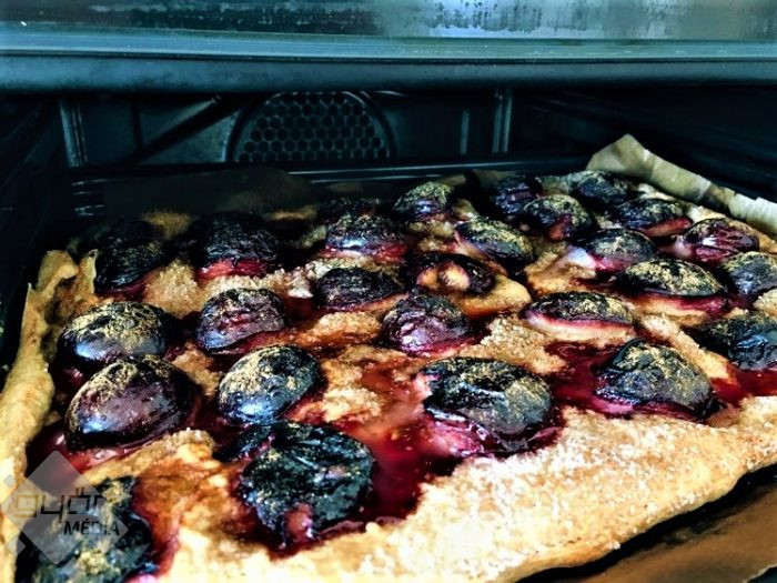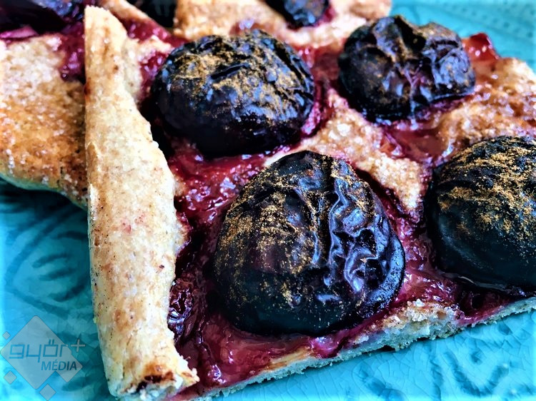 Kiveszem a tálból, újra átgyúrom és lisztezett felületen kinyújtom egy sodrófa segítségével. A kinyújtott lapot újra enyhén meglisztezem, majd óvatosan feltekerem a sodrófára és így teszem rá a sütőpapírral bélelt tepsire. Ezután jöhetnek a felezett szilvák lefelé rakva és sorba. Alaposan megszórom kristály- vagy barnacukorral és sok fahéjjal. Előmelegített, alul-felül sütésen, 190 fokon 35 perc alatt megsütöm.