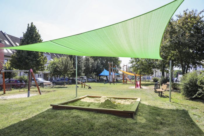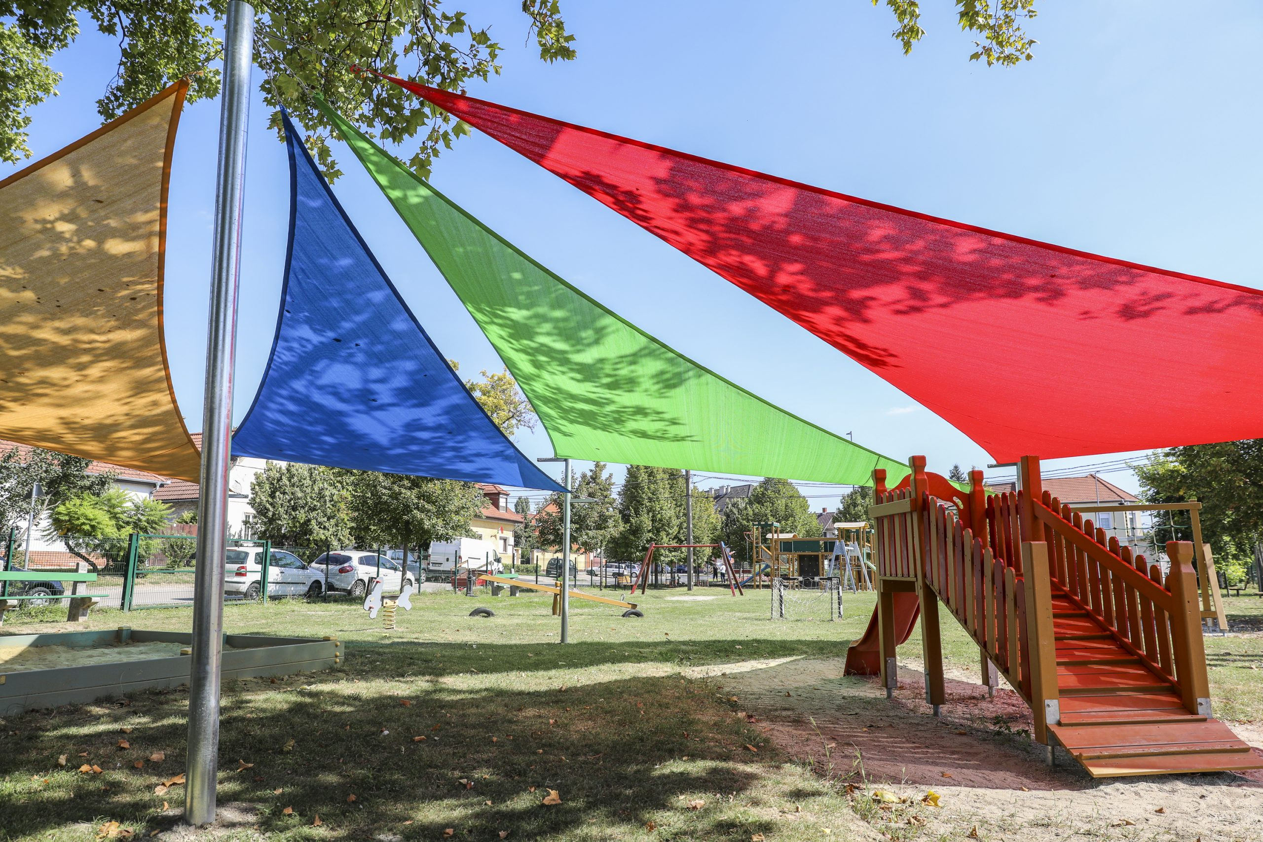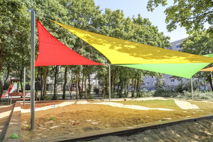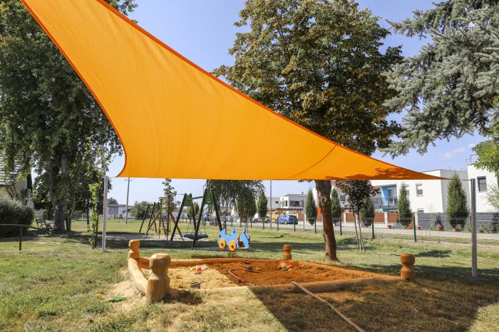 Így jött a gondolat, hogy valamennyi győri játszótér fölé színes napvitorlákat húzunk fel, hogy alattuk a gyerekek és a szülők árnyas környezetben, égető nap nélkül töltsék az idejüket.