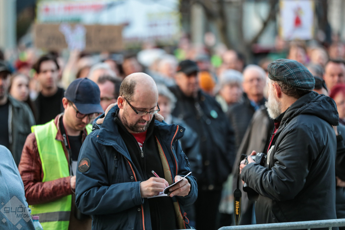 Az identitászavart tovább növelte, amikor az LMP tulajdonában lévő ugytudjuk.hu szerkesztője, Pintér Bence műsorvezetőként nyitotta meg a mintegy 200 embert megmozgató rendezvényt a Városháza előtt. Pintér magyarázkodással kezdte: merthogy ő ugyan újságíró, de itt és most nem ebben a szerepben van jelen. Nyilván írói munkássága részeként vállalta a felkérést.