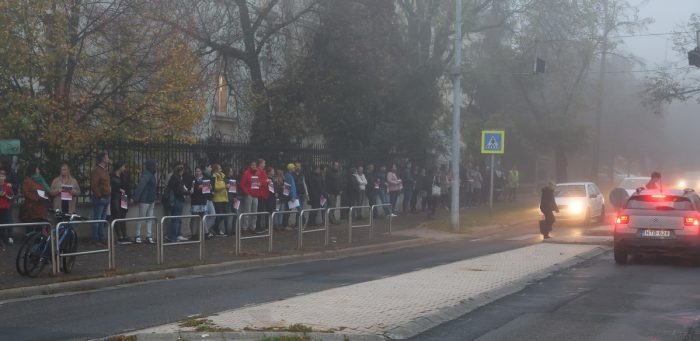 Közel negyven percig tartott az élőlánc akció, eközben rengeteg támogató dudálást is kaptak a szülők.