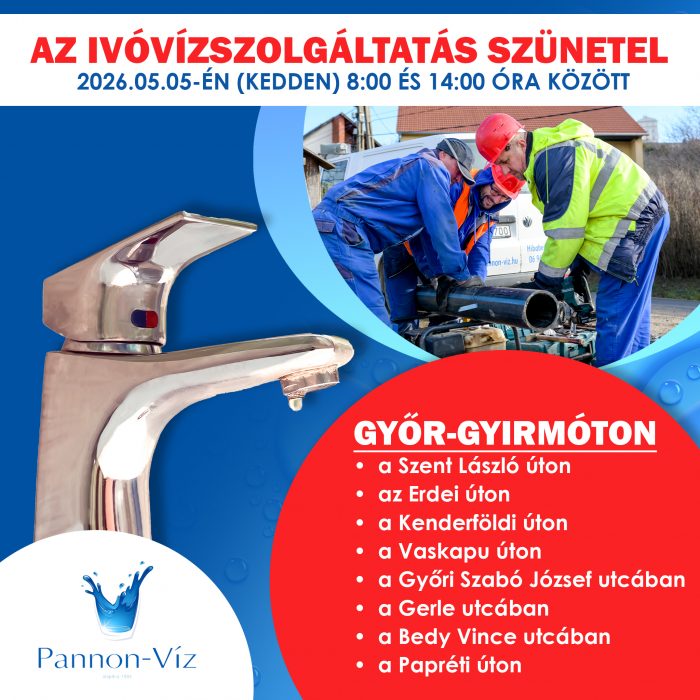 A szolgáltató tájékoztatása szerint 2026. május 5-én, várhatóan 8:00 és 14:00 óra között szünetelni fog a vízszolgáltatás az érintett területen.