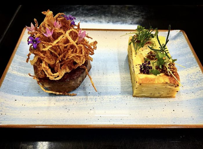 Hagymás rostélyos szarvasgombás burgonyagratinnal a modern konyha kedvelőinek