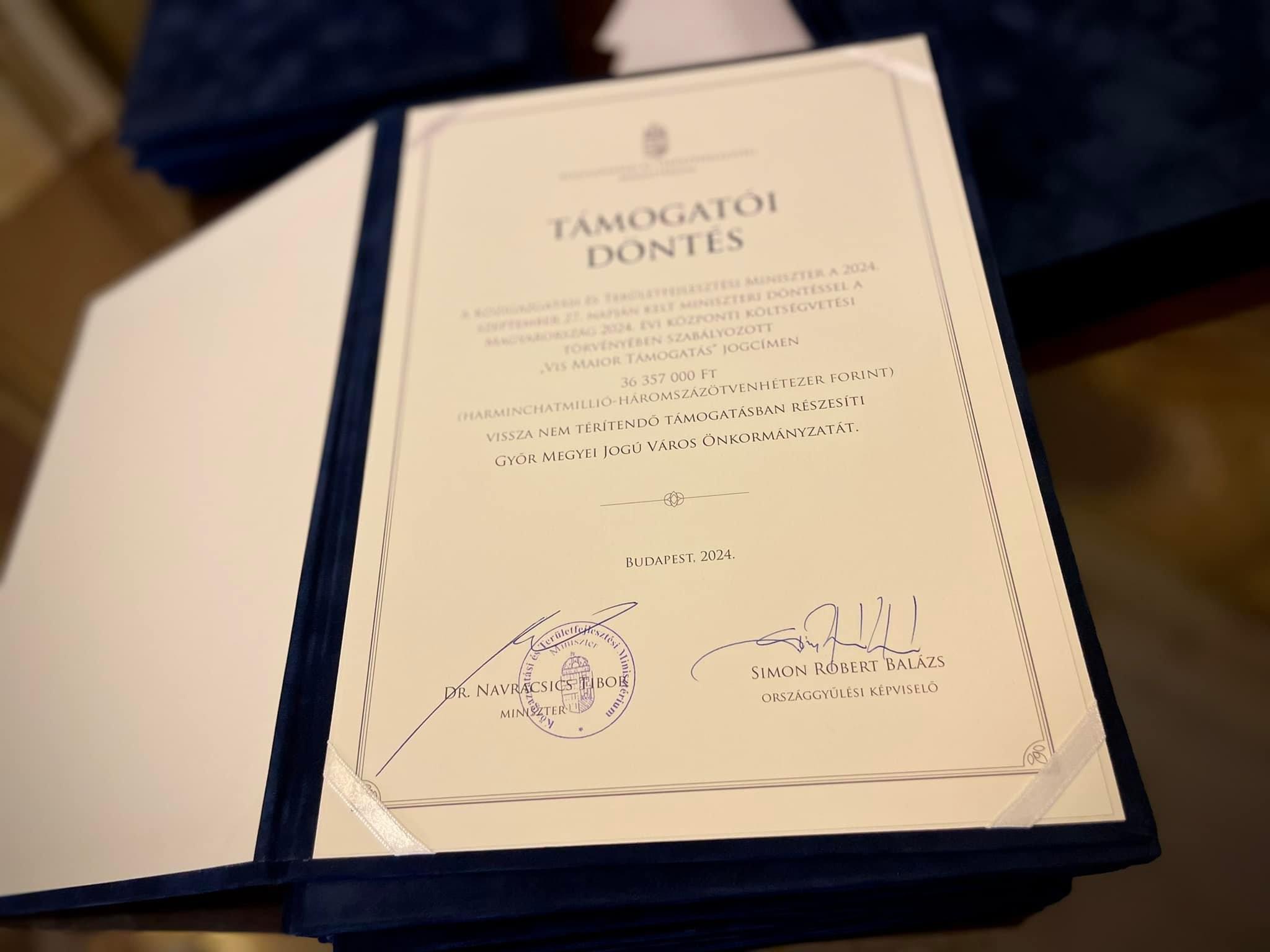 A támogatásról szóló okiratot Navracsics Tibor közigazgatási és területfejlesztési miniszter és Simon Róbert Balázs országgyűlési képviselő adta át kedden Budapesten Pintér Bencének, Győr polgármesterének.