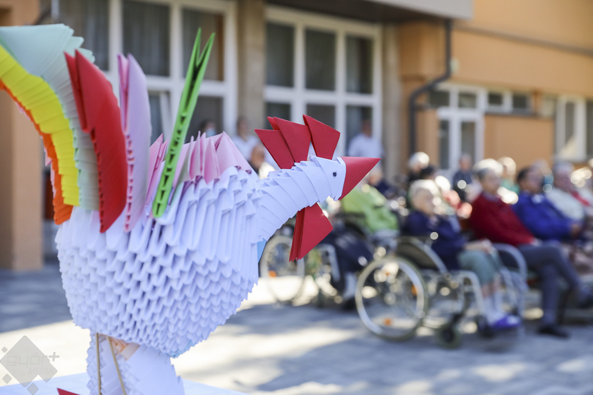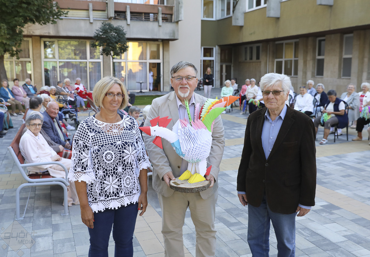 A közös éneklés egy igazán felemelő pillanata volt a csütörtöki programnak. Nem csak az udvaron, de az emeletes házak erkélyein és ablakaiban is beszálltak a dalolásba. Ezt követően adták át a város polgármesterének azt a 750 darab különféle papírból készült kakast, melyet Győr 750-es jubileumára alkottak az idősek. Dr. Dézsi Csaba András útravalóul azt tanácsolta a vendéglátóknak, naponta kétszer csinálják meg a táncot, valamint énekeljenek egy jót és rendben lesz a keringésük.