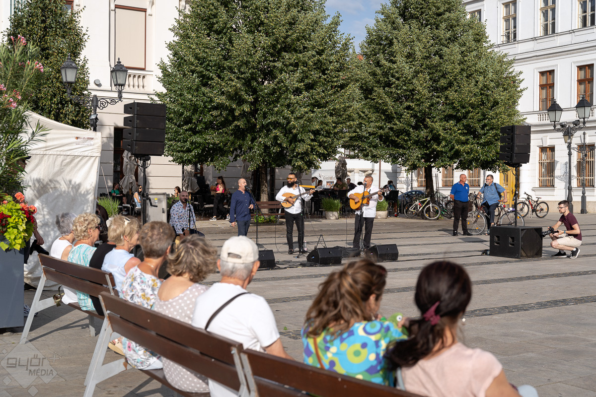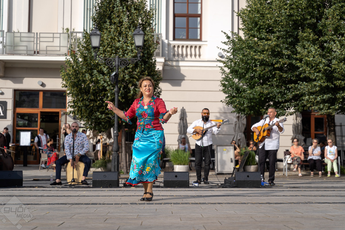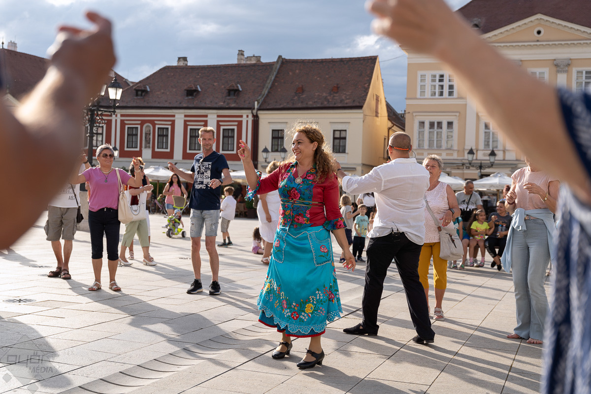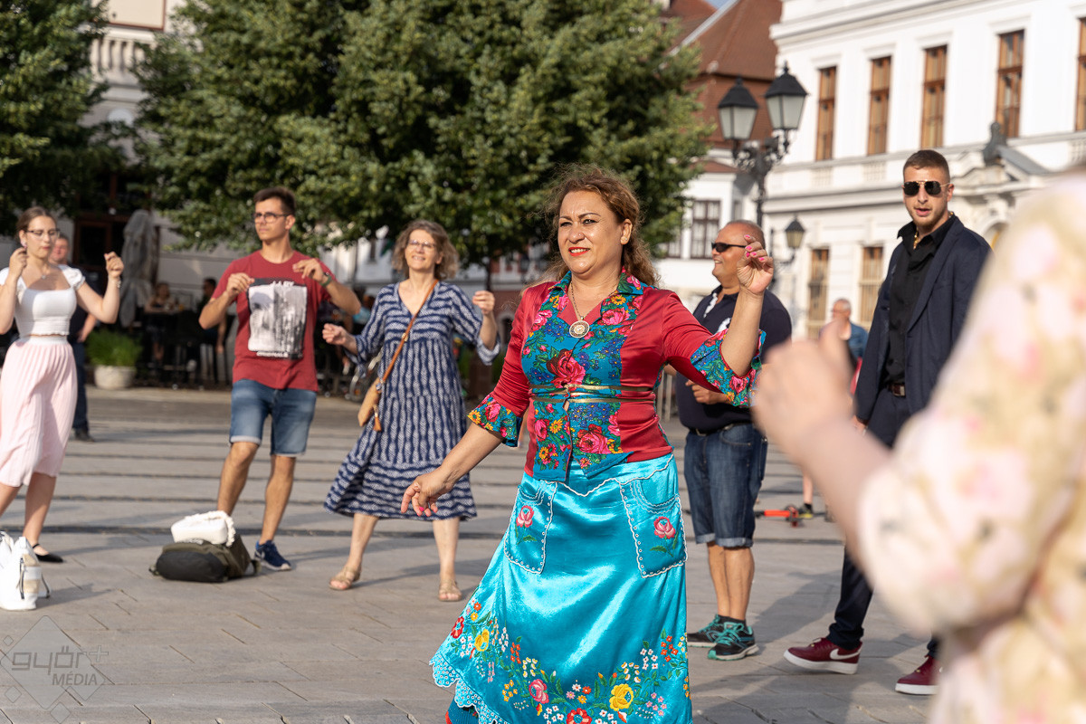 Táncparketté változott a győri Széchenyi tér, ahol zenével és tánctanítással klasszikus roma táncházat rendeztek pénteken este.