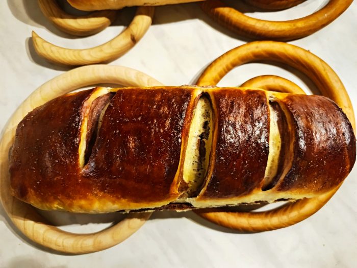 Másfél deci langyos, cukros tejben felfuttatunk 2,5 dkg élesztőt. Átszitálunk 38 deka lisztet, csipetnyi sóval, 6 deka porcukorral, egy tojás sárgájával, 5 deka lágy vajjal és az élesztős tejjel összekeverjük. Szép, sima tésztát dagasztunk belőle, majd kettéosztjuk. A felébe belegyúrjuk az előzőleg jól kikevert 1evőkanál kakaópor, 1 evőkanál cukor és 2 evőkanál tej elegyét. Letakarva egy órán át kelesztjük.