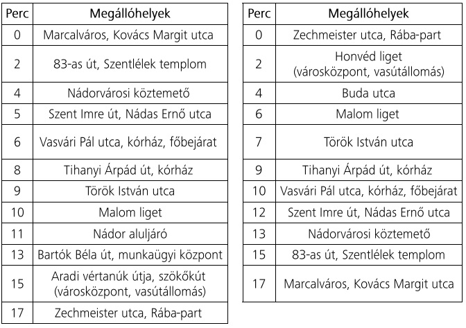 - Marcalváros, Kovács Margit utca megállóhelytől 9:40-től 18:10-ig 30 percenként;