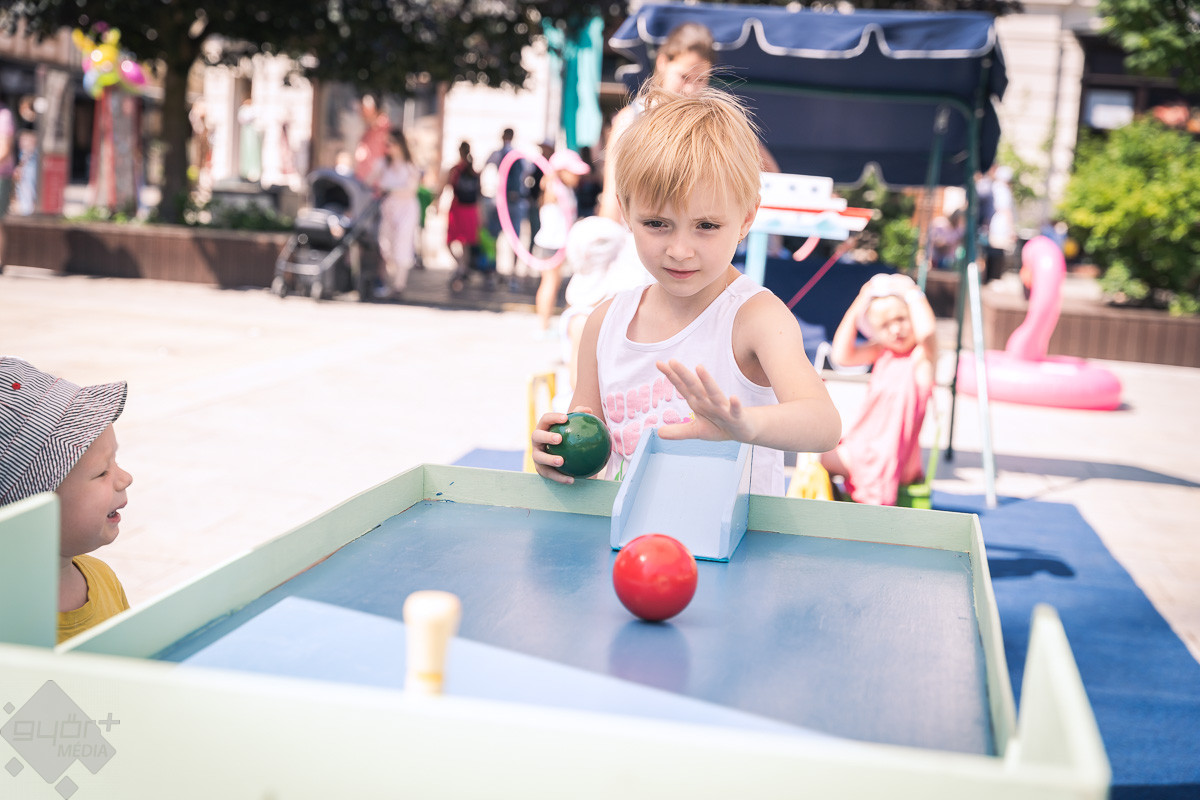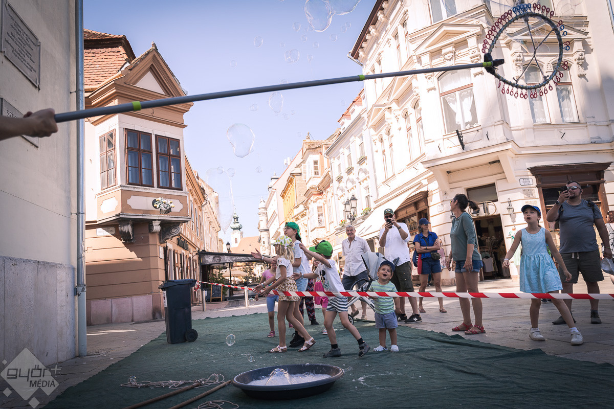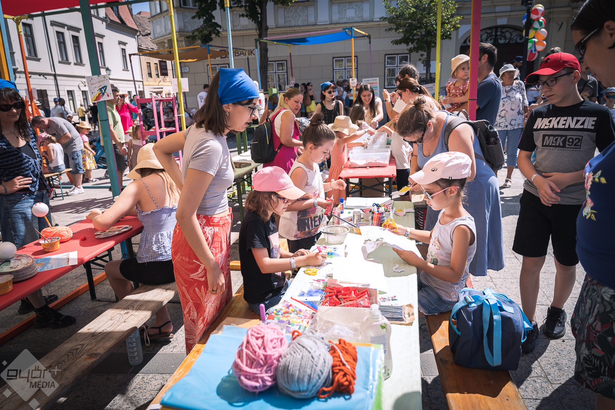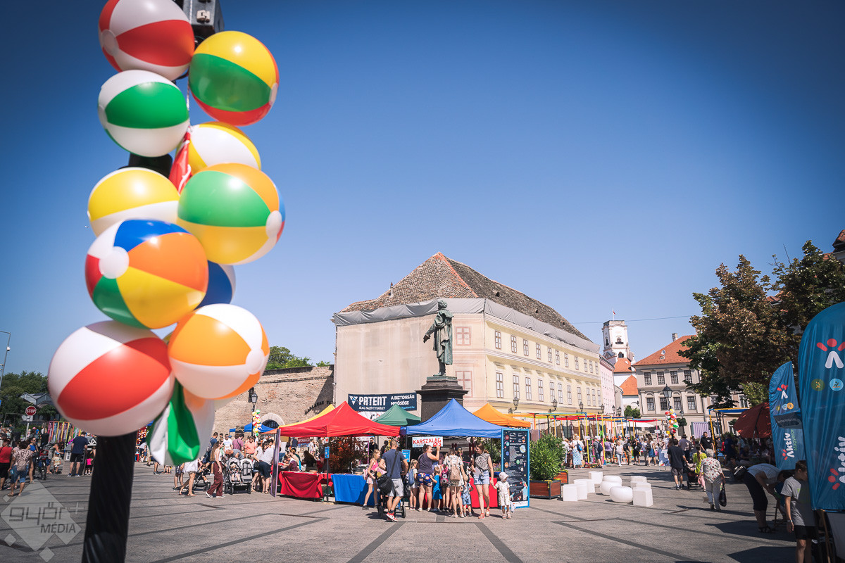 „A Széchenyi tér egy hullámzó Győrkőc tér, ezt nem lehet leárnyékolni, úgyhogy ott mindig vizes játékok vannak a gyerekeknek. „Mesevásár” van a Kazinczy utcában, ahol egy csomó kézműves terméket is meg lehet találni, ezt a szülők is szeretni szokták nagyon. A Bécsikapu tér a központ, ez egy ilyen kaleidoszkópszerű rész. Itt van bábszínház, természettudományos játék, pihenős rész is. A Király utca lett a „Fess utca”, és van ott úgynevezett újrahasznosítós játék, de a rendőrség autóit és eszközeit is ki lehet próbálni. Az ágyúknál, ha lemegyünk, itt van a „Tudós kikötő”, ahol a matematika és a tudomány minden játékos arcát megismerhetik a gyerekek.