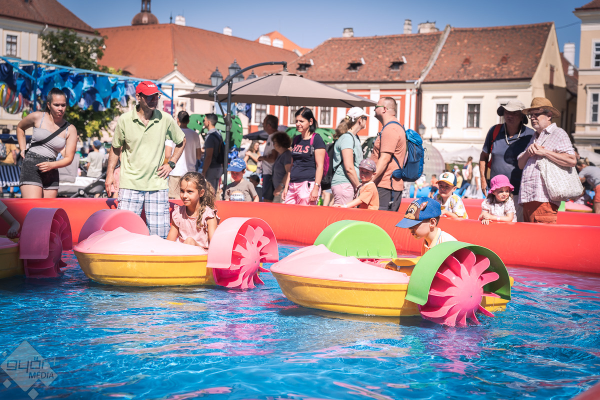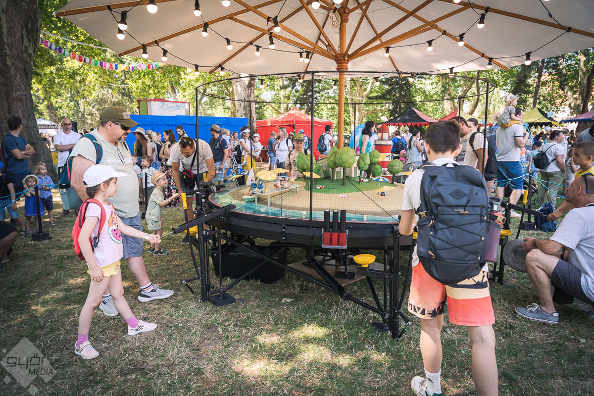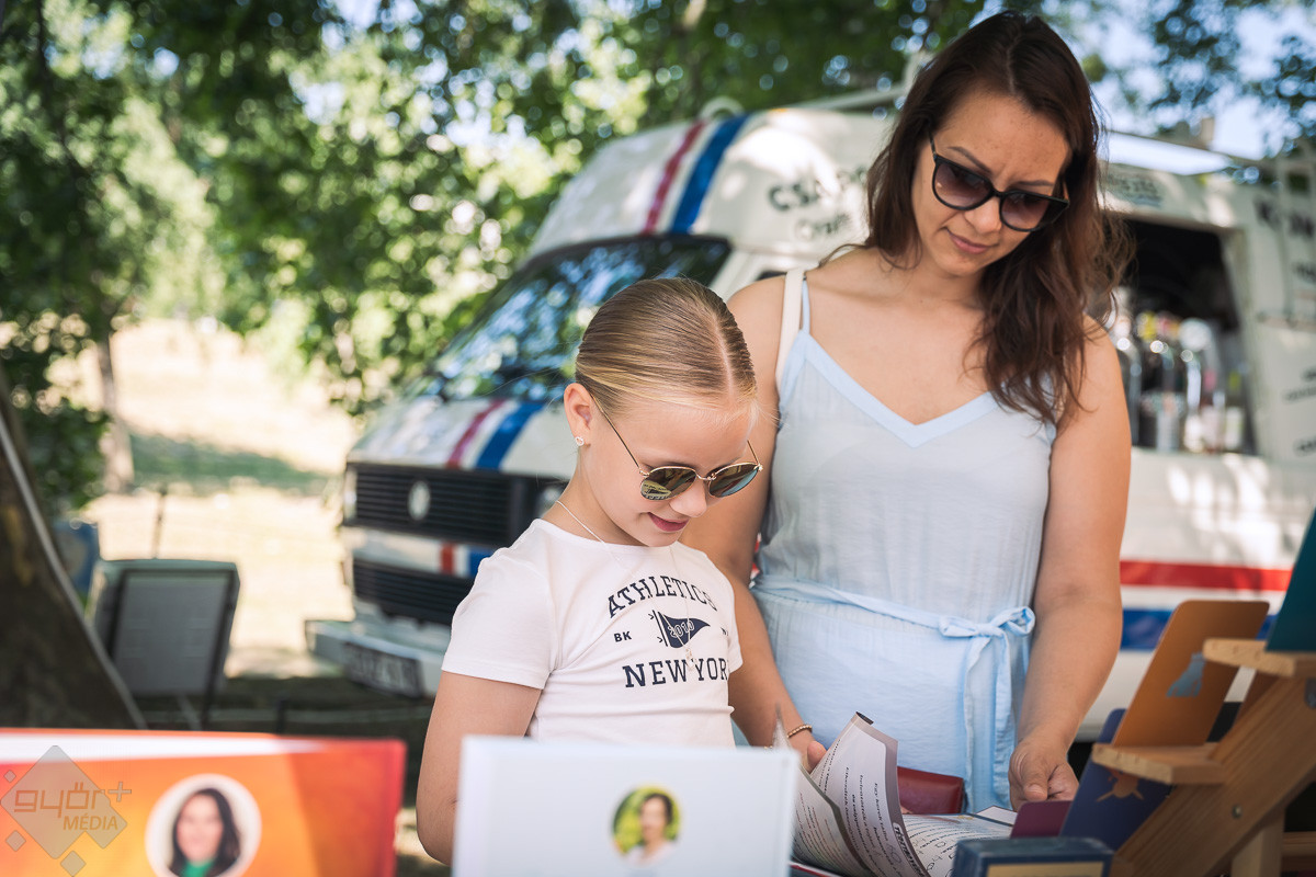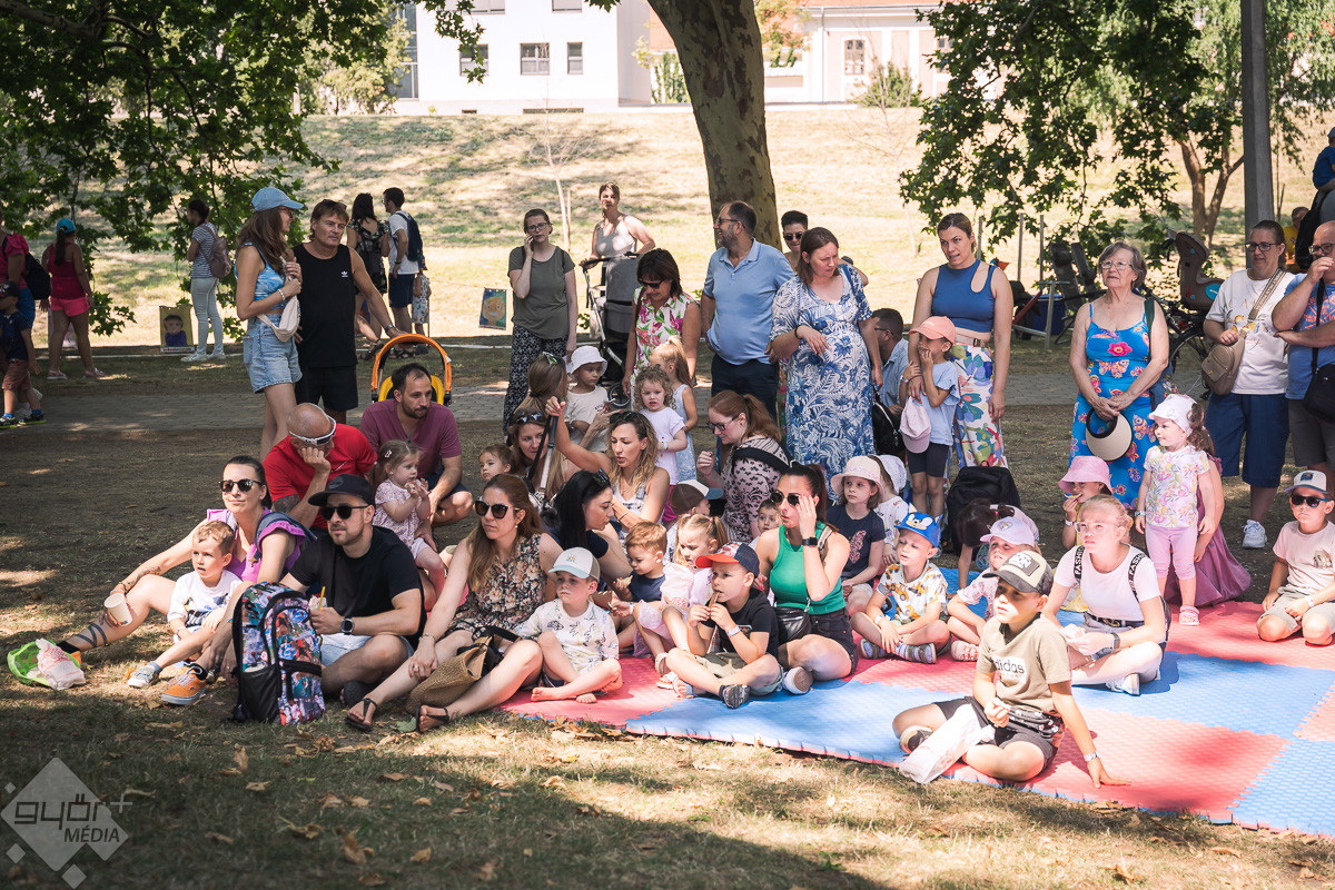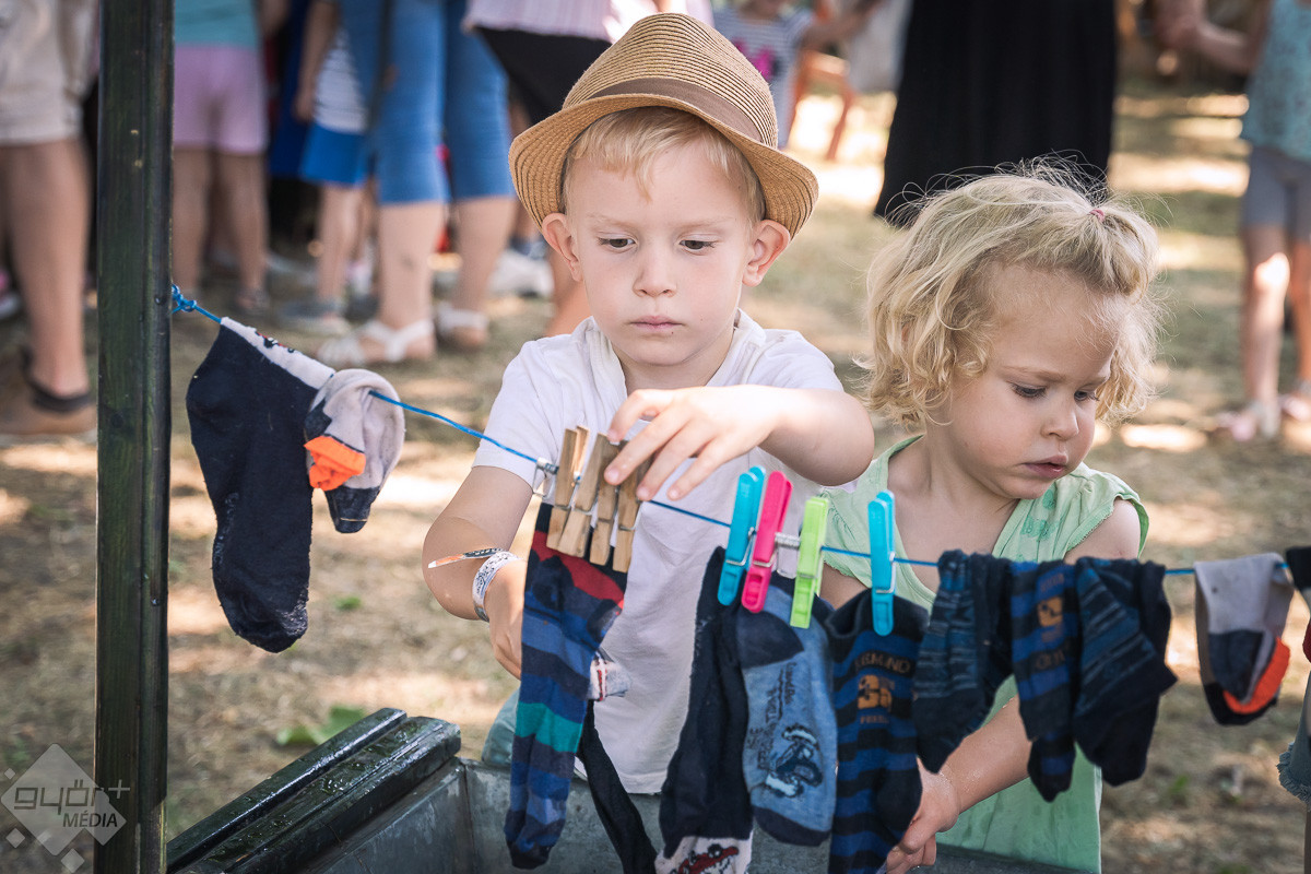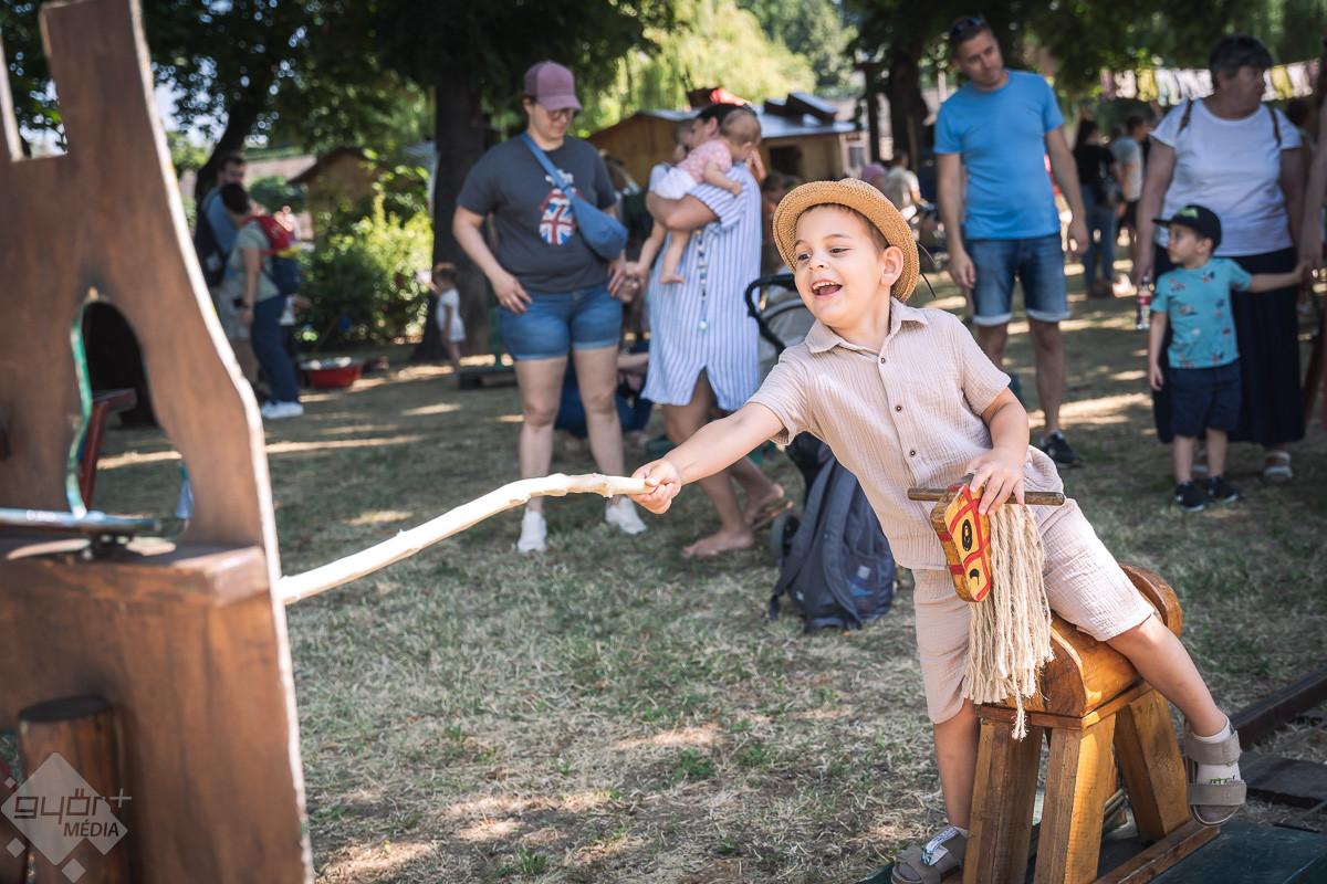 A „Varázshídon” vannak az ugrálós és társasjátékok. A Radónak a bal oldalán van a „Medenceszínpad”, mögötte a „Meseváros„ ahol előadások és még lovagi torna is található. Leghátul pedig a „Versjátszótér”, ismert költőkkel és írókkal. Nagyon fontos helyszín még a „Győrkőcfalu”, ahol a Lippentő Táncegyüttes táncházzal várja a gyerekeket, a vásártéren is előadások vannak. Velünk van a Kisalföld Népművészeti Egyesület is, akik minden évben kijönnek. Van „Babakert” és természetesen körhinta is. Egyszóval nagyon boldog vagyok, hiszen ez egy csodálatos rendezvény.” – fejtette ki a főszervező.