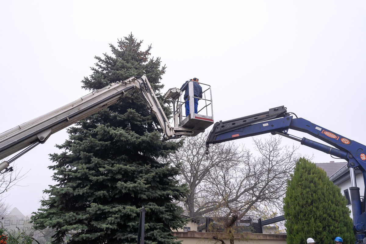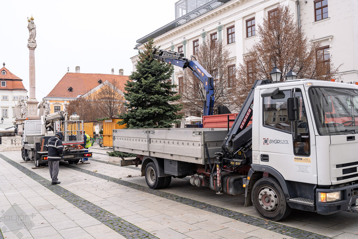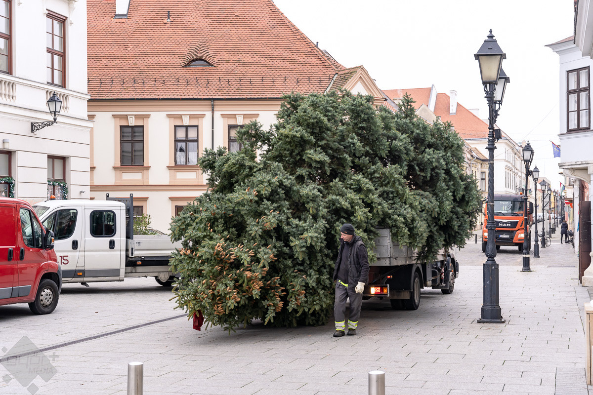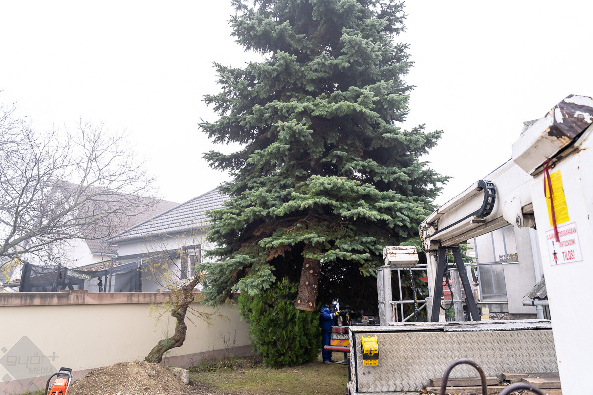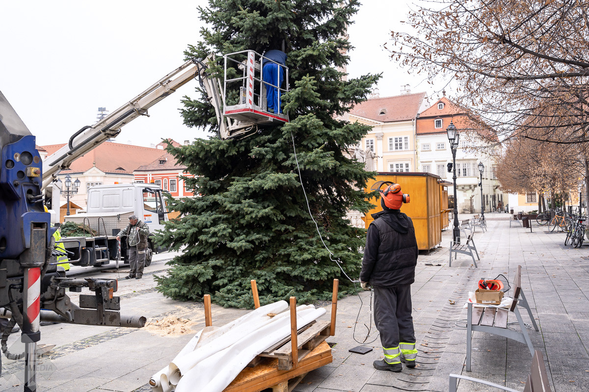 A mintegy 10 méter magas, nagyjából 32-33 éves fenyőt a következő napokban feldíszítik és kivilágítást is kap, péntektől a fa lesz az adventi időszak egyik fő látványossága Győrben.