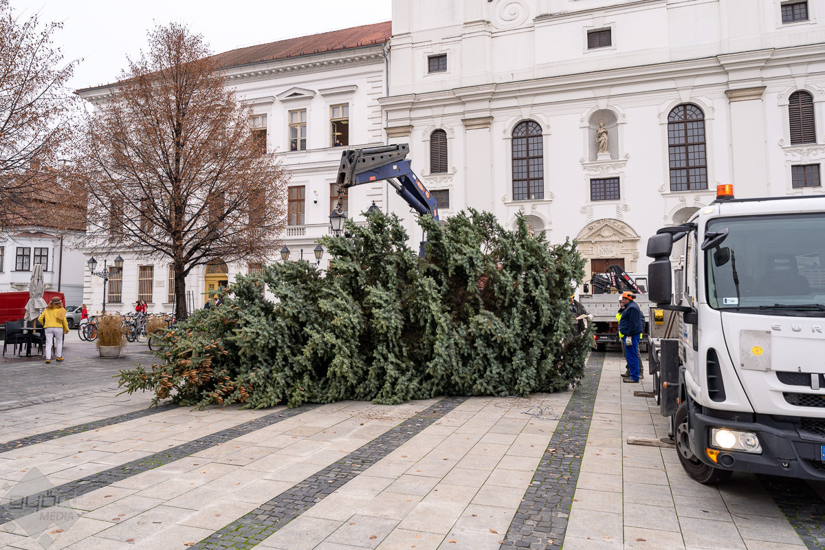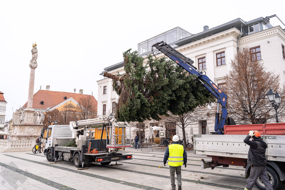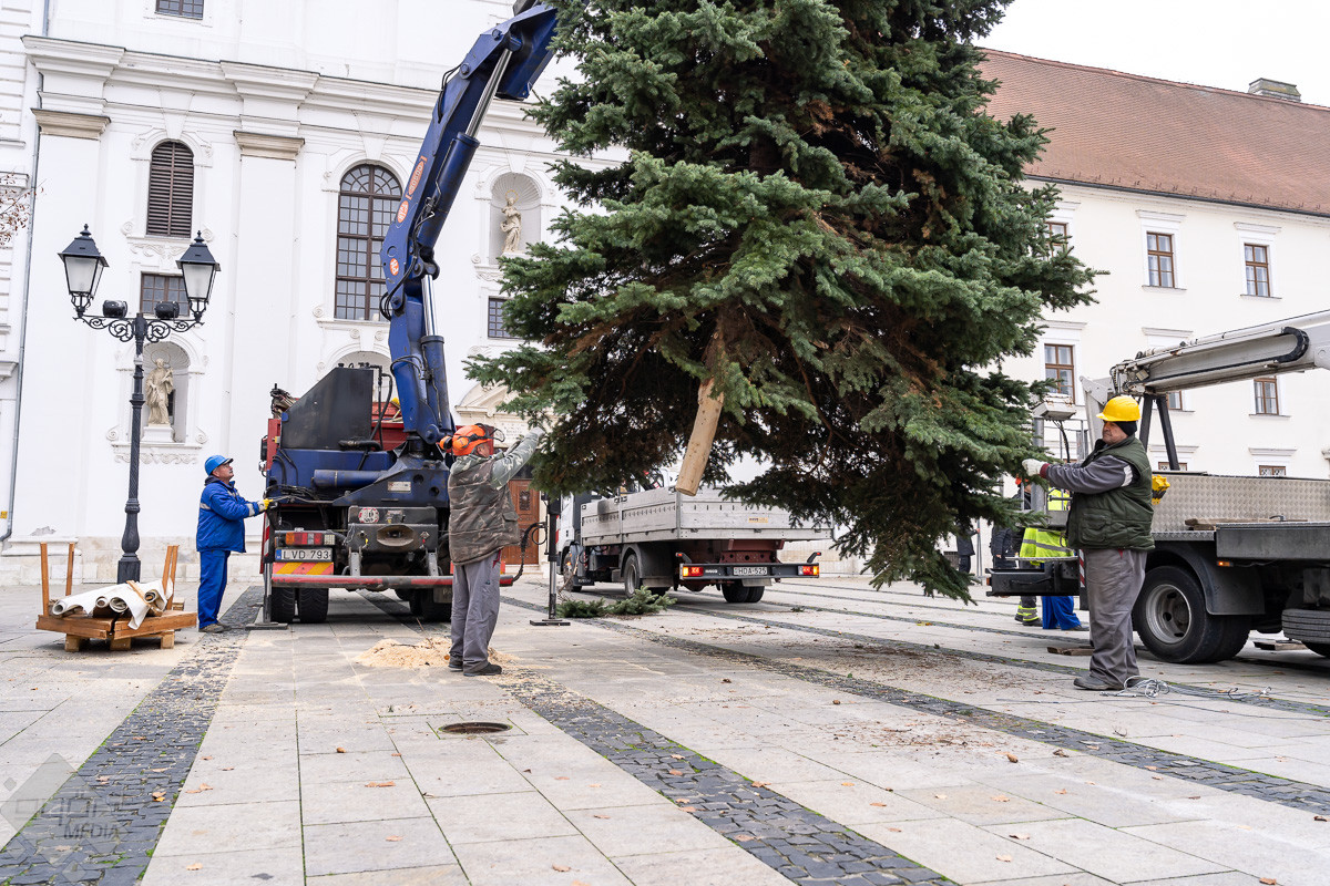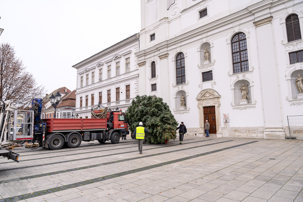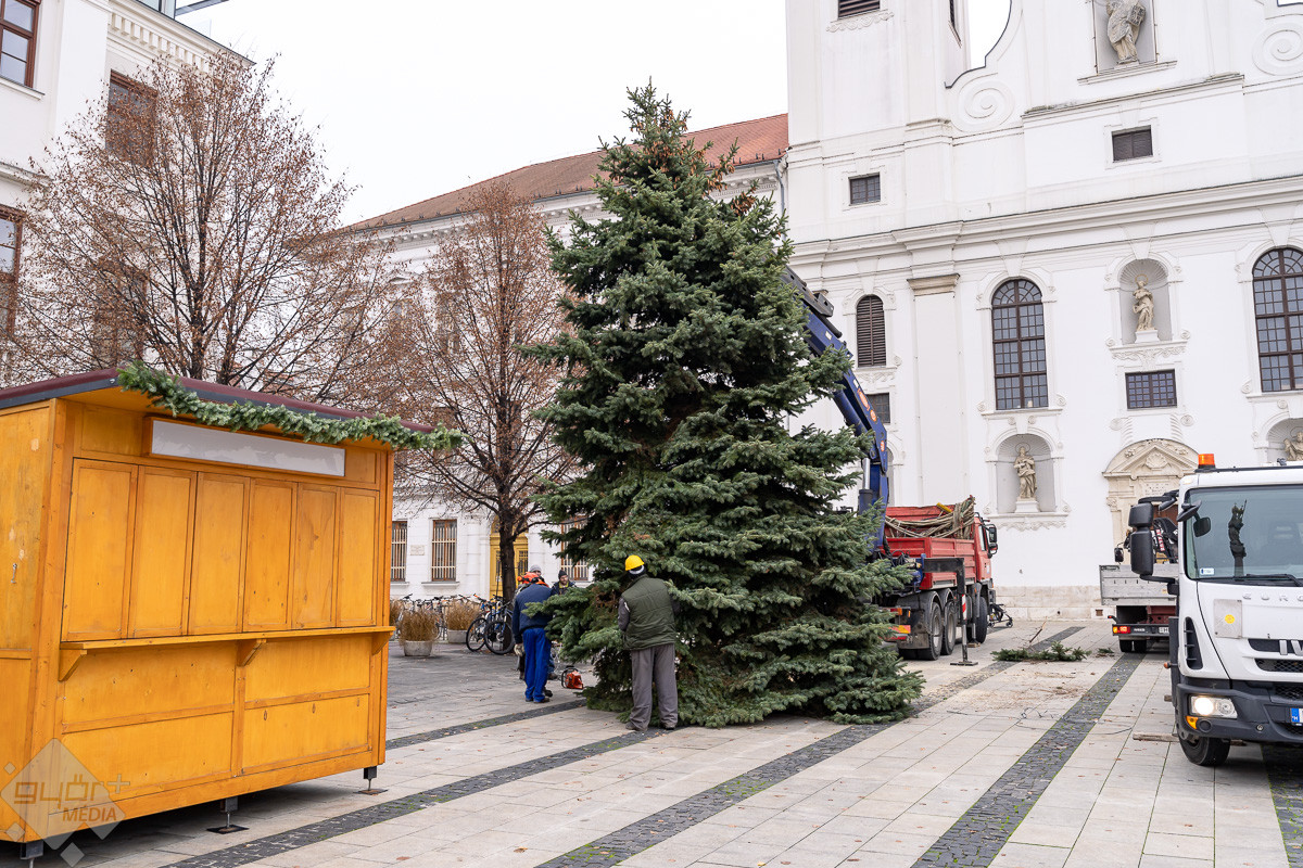 A mintegy 10 méter magas, nagyjából 32-33 éves fenyőt a következő napokban feldíszítik és kivilágítást is kap, péntektől a fa lesz az adventi időszak egyik fő látványossága Győrben.