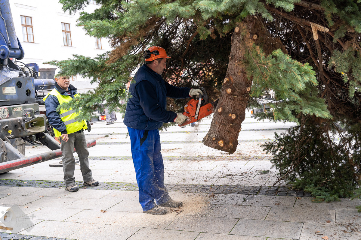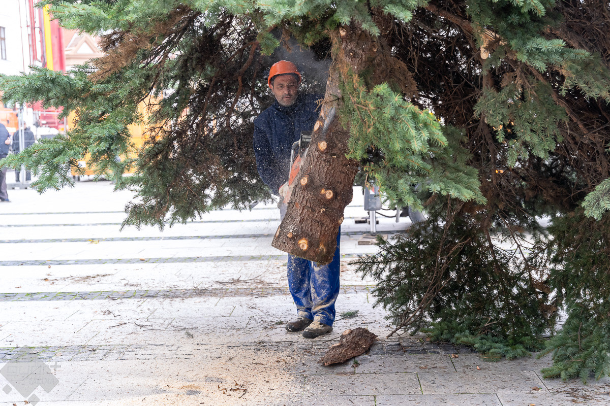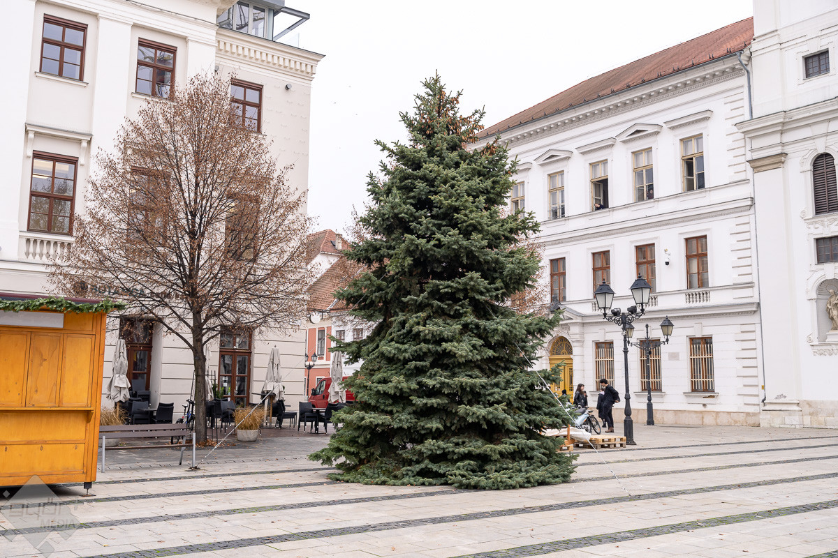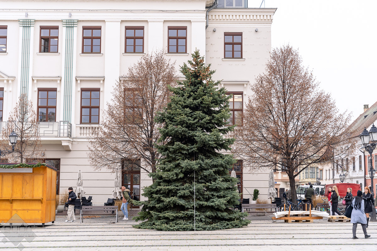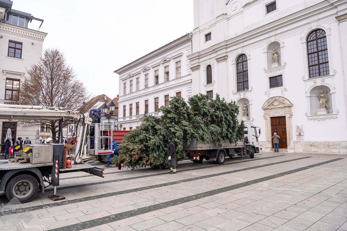 A mintegy 10 méter magas, nagyjából 32-33 éves fenyőt a következő napokban feldíszítik és kivilágítást is kap, péntektől a fa lesz az adventi időszak egyik fő látványossága Győrben.