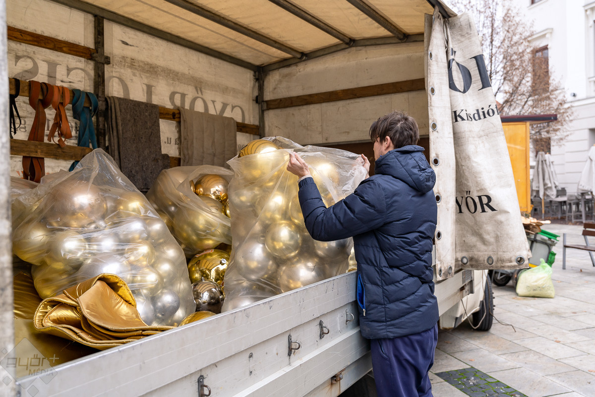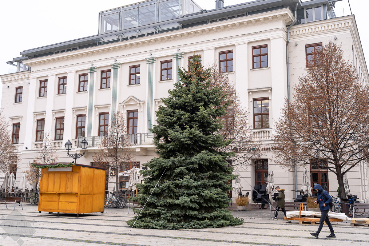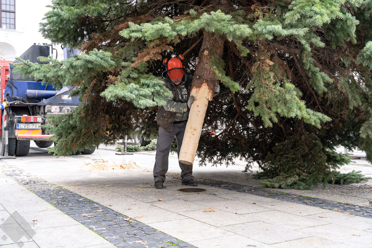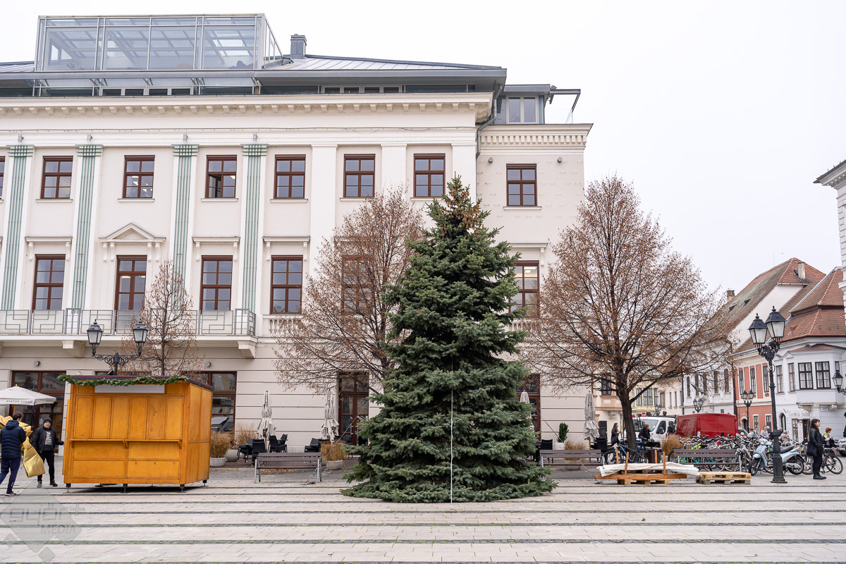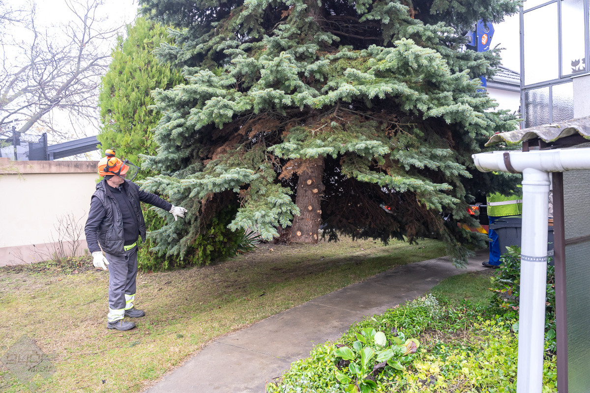 A mintegy 10 méter magas, nagyjából 32-33 éves fenyőt a következő napokban feldíszítik és kivilágítást is kap, péntektől a fa lesz az adventi időszak egyik fő látványossága Győrben.