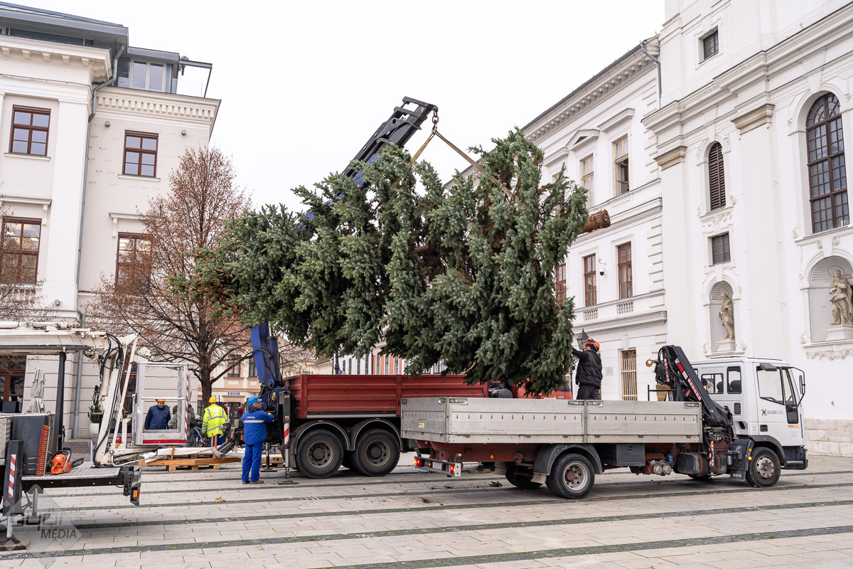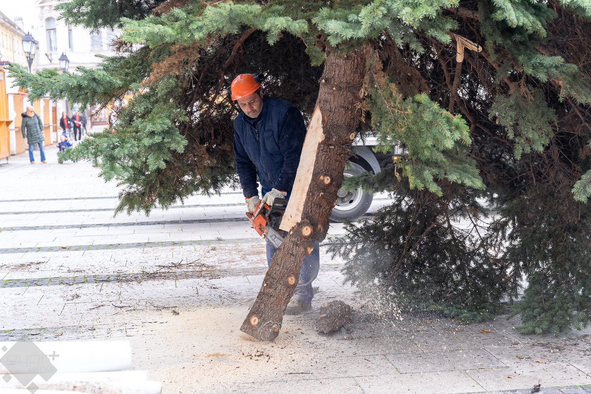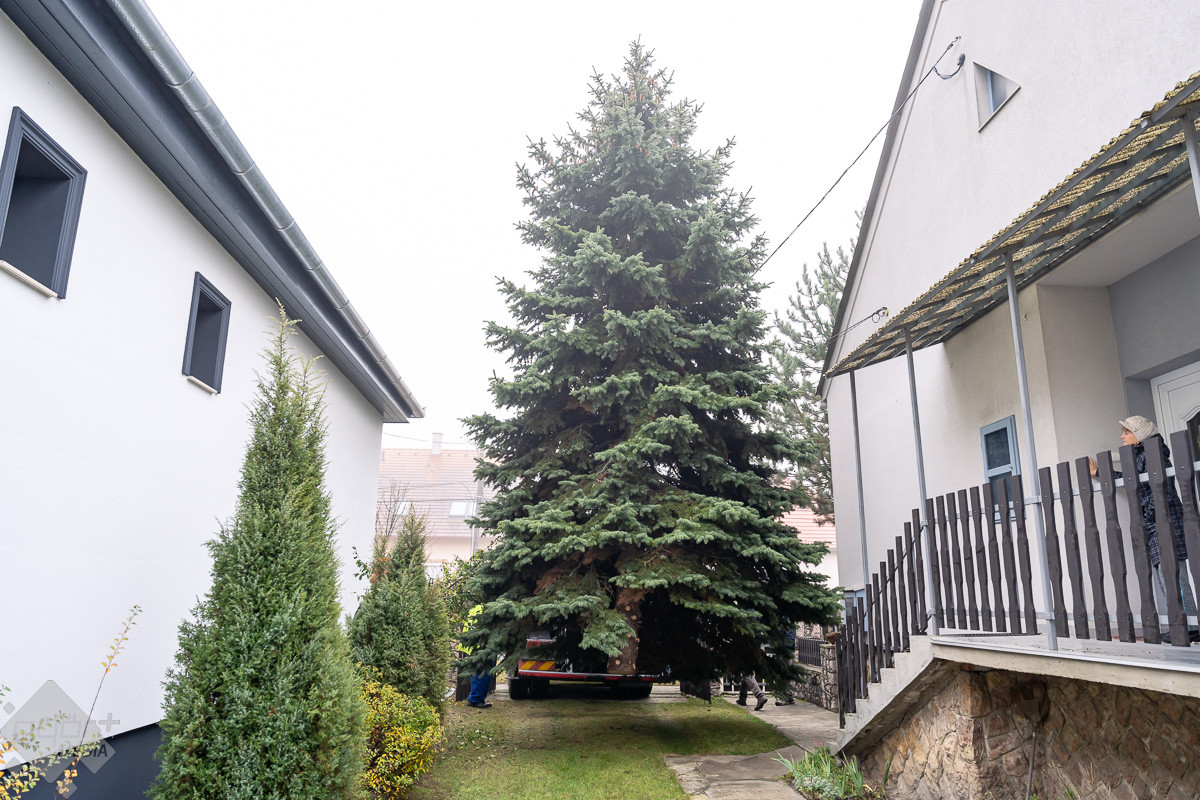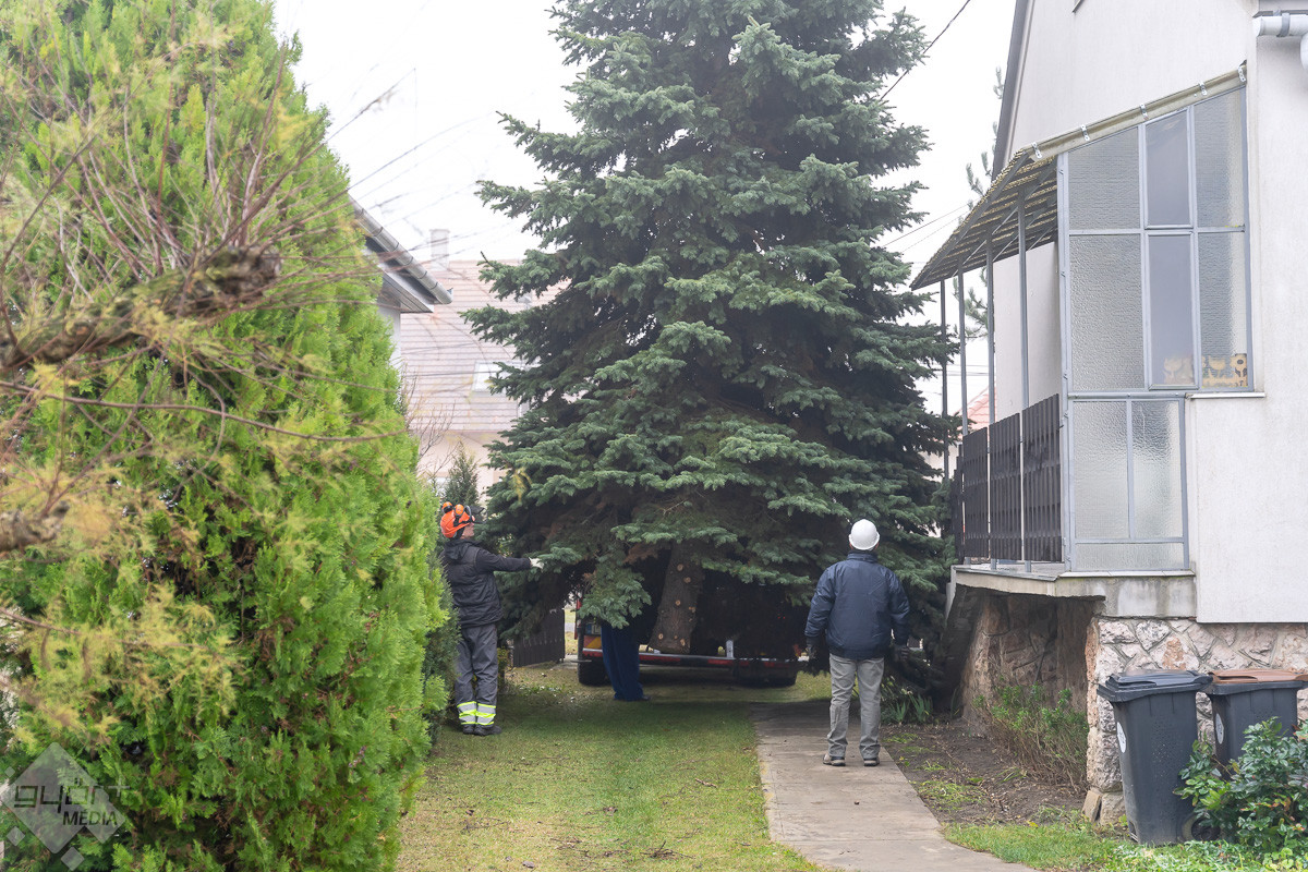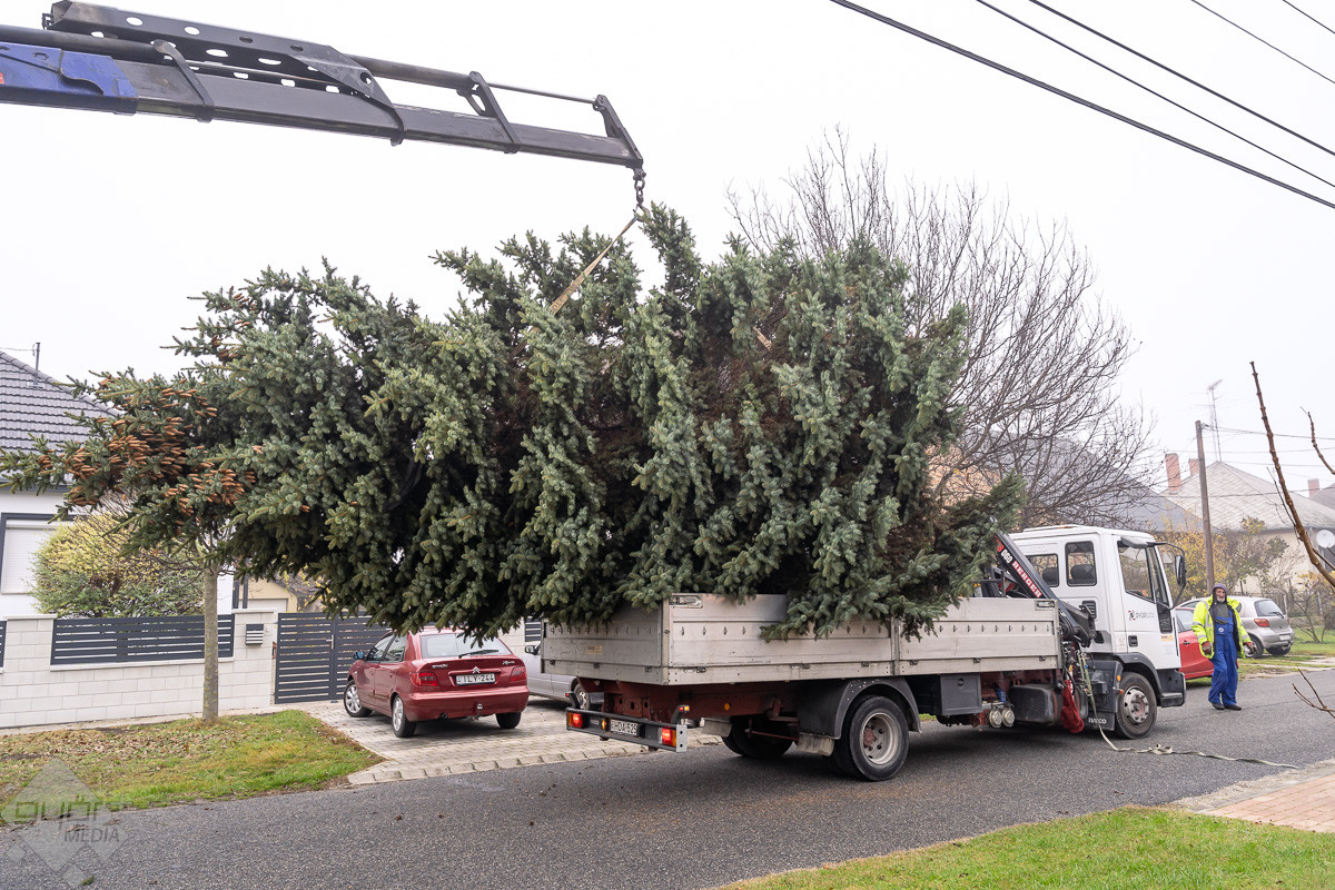 ”Kora reggel darus kocsival érkeztek kollégáim a szentiváni családi házhoz, ahol motoros fűrésszel vágták ki a hatalmas fenyőt, aztán pedig teherautóval szállították a Belvárosba, ahol a Széchenyi téren, a szokásos helyre állították fel, természetesen jó alaposan rögzítették is, hogy ne eshessen baja a következő időszakban” – hangsúlyozta Ozsvárt Tamás, a szolgáltató ügyfélszolgálati és kommunikációs csoportvezetője.