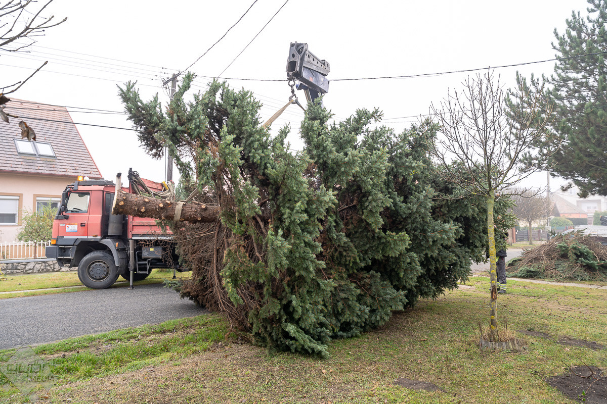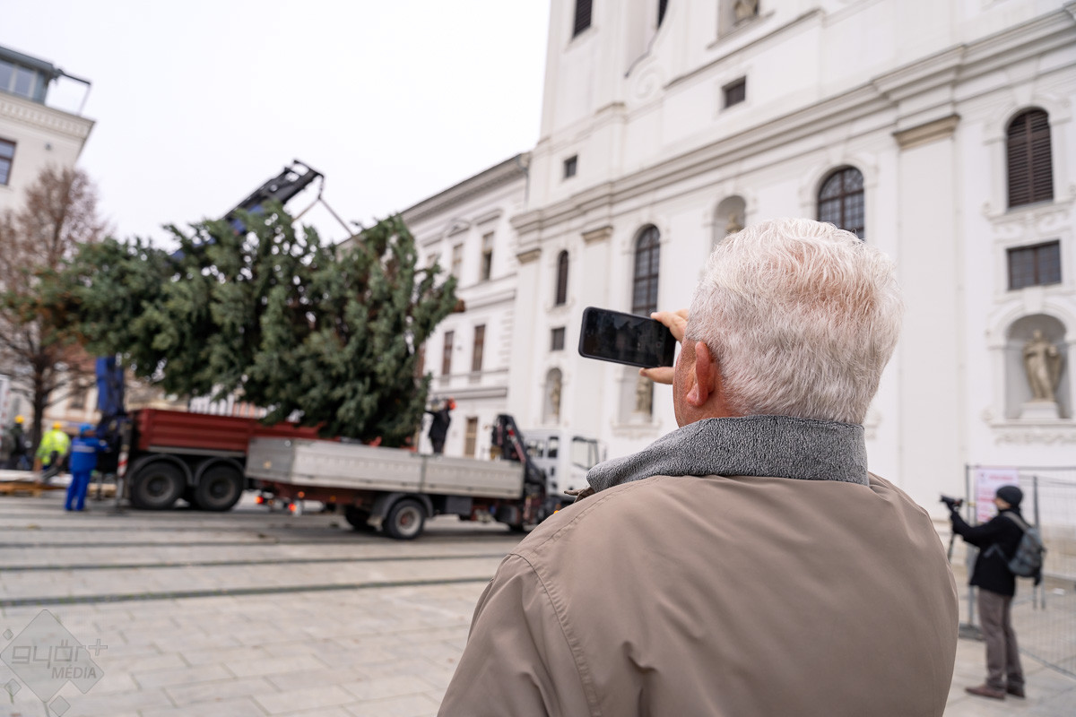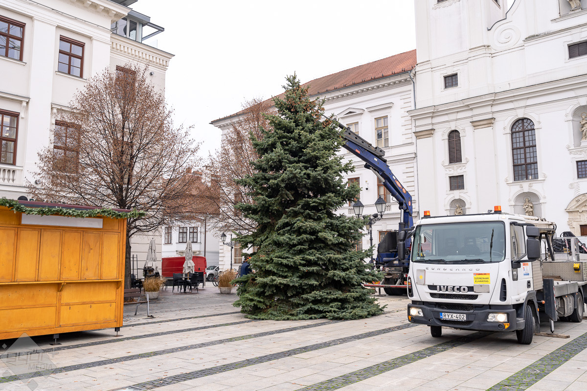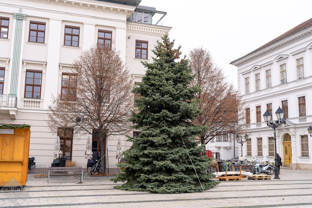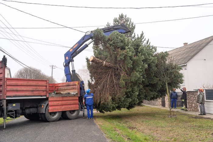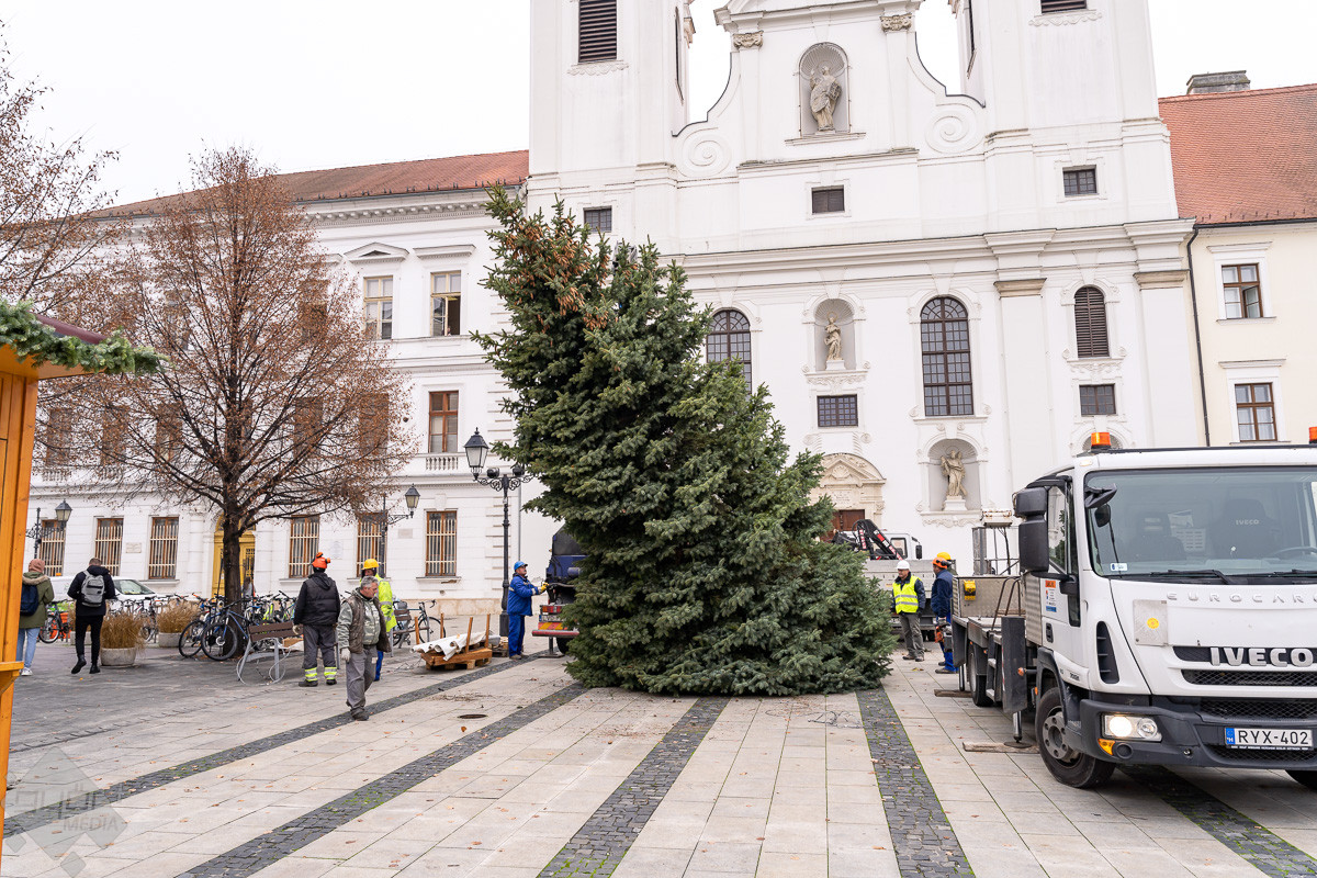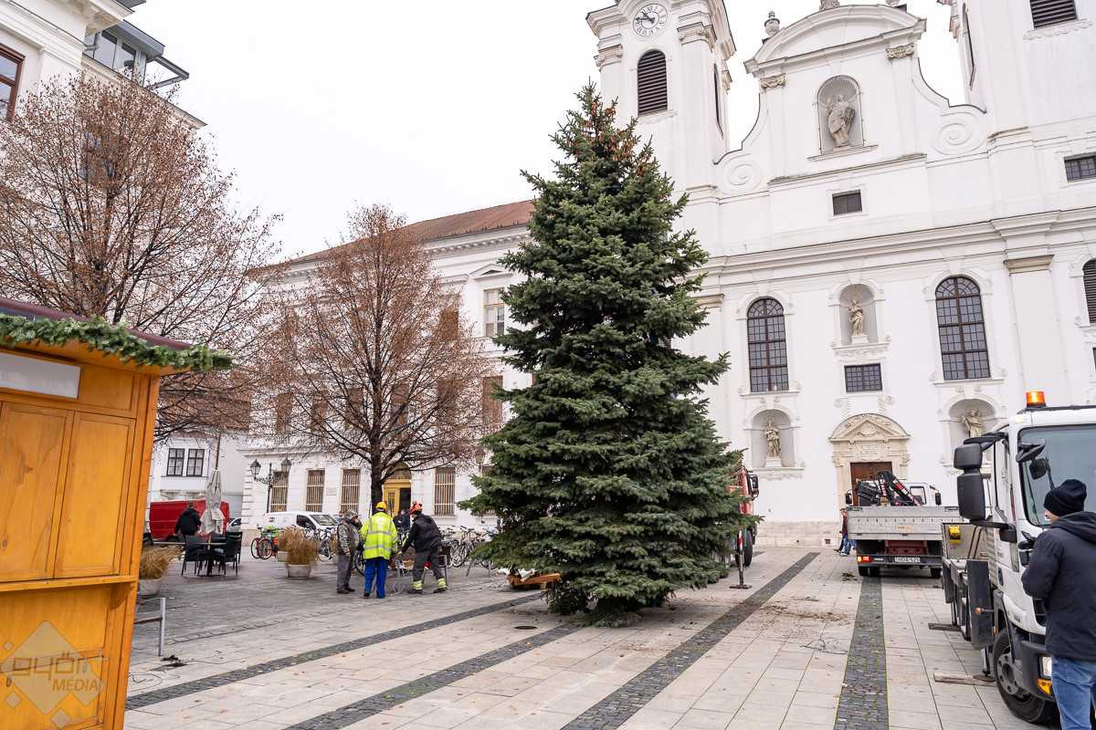 ”Kora reggel darus kocsival érkeztek kollégáim a szentiváni családi házhoz, ahol motoros fűrésszel vágták ki a hatalmas fenyőt, aztán pedig teherautóval szállították a Belvárosba, ahol a Széchenyi téren, a szokásos helyre állították fel, természetesen jó alaposan rögzítették is, hogy ne eshessen baja a következő időszakban” – hangsúlyozta Ozsvárt Tamás, a szolgáltató ügyfélszolgálati és kommunikációs csoportvezetője.