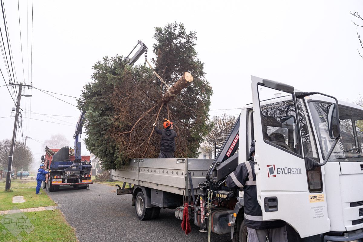 Több, mint 10 méter magas, gyönyörű ezüstfenyő Győr idei karácsonyfája. A formás tűlevelűt nagyjából 30 éve ültette a győrszentiváni Pintér Ferenc, eredetileg földlabdás karácsonyfának vették, utána került a kert végébe. Azóta jól megnőtt a fenyő, amit időnként a nagyobb szelek időnként megtépáztak, a helyét is kinőtte, ezért ajánlotta fel tulajdonosa a fát a városnak. A hatalmas fenyőt darus kocsival vitték a Széchenyi térre, ahol a következő napokban feldíszítik, aztán péntektől az adventi időszak fő látványossága lesz.