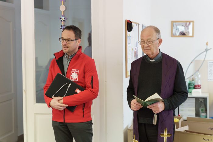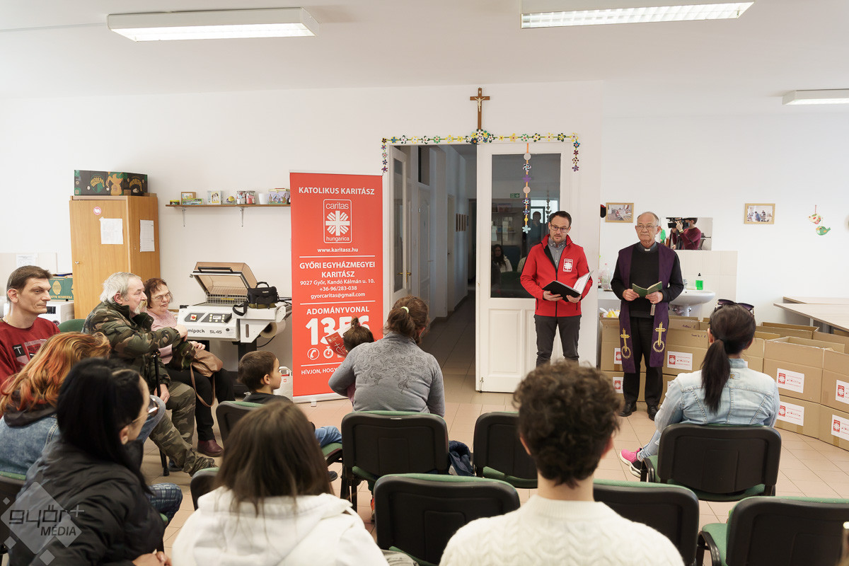 Az igazgató köszöntőjét követően Berkes Gyula áldotta meg a csomagokat, az étkeket. A nádorvárosi plébános elmesélte gyerekkori élményeit is, mikor szüleivel és testvéreivel a szanyi templomba látogattak el évről-évre a húsvéti áldásért. „Adakozni mindig érdemes és mindig jó, ezért örömteli számunkra, hogy ilyen sok jó szándékú győri csatlakozott a kampányhoz, önként és szívesen hozták a felajánlásokat hozzánk a templomba is” – árulta el Berkes Gyula a Győr+ Médiának.