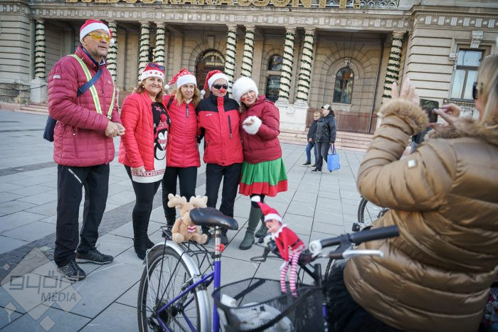 „Szerencsére az időjárás is kegyes hozzánk, tegnaphoz képest ma már szépen süt a nap, igazi bringás idő van!” – kezdte Tömböly Tamás, aki azt is elmondta, hogy erre a rendezvényre most elsősorban felnőttek jelentkezését várták, hiszen a Mikulás-jelmezben való kerekezés nem is annyira egyszerű, mint elsőre gondolnánk. Kellett tehát a megfelelő bringás ismeret, és az is, hogy mindenkinek legyen valamilyen jelmeze.