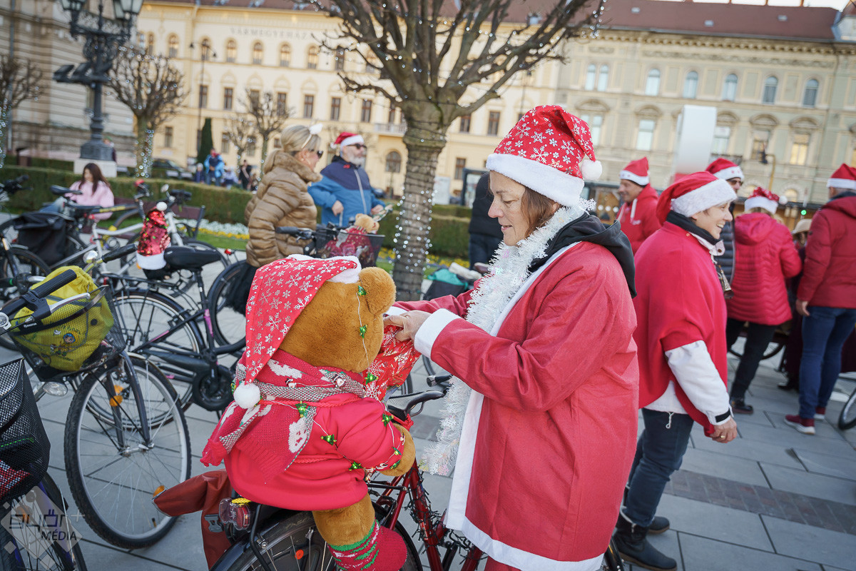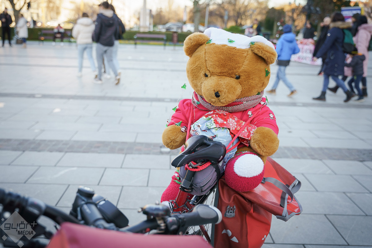 A feldíszített bringás, macikkal, manókkal és Mikulás-ruhákkal, sapkákkal felszerelkezett kerékpárosok pedig széles mosollyal az arcukon érkeztek. Mindenki várta már a találkozást a gyermekekkel: mert a cél többek között ez is volt a rendezvénnyel.