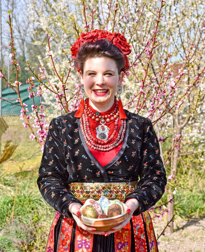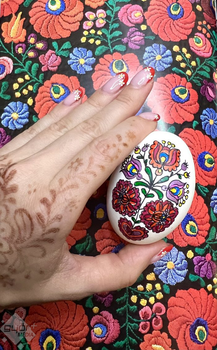 „Minden tojás hátuljára ráírtam egyébként, hogy melyik tájegységhez köthető az adott minta, így nemcsak esztétikai értéket adhatnak, hanem egy kis tanítást is” – teszi hozzá mosolyogva Auróra. Közben engem is bevon a munkába, s bár van hova fejlődnöm, motiválva azt mondja: „Téged is és mindenkit arra biztatok, hogy készítsen otthon saját kezűleg festett tojást, vegye elő a saját örökségét, például a nagymama által hímzett párnahuzatokat és azok mintáit filccel rajzolja fel a tojásra. Ennél nincs is örömtelibb alkotás, amikor szívvel-lélekkel értékmegőrző és -teremtő gyöngyszemek születnek!”