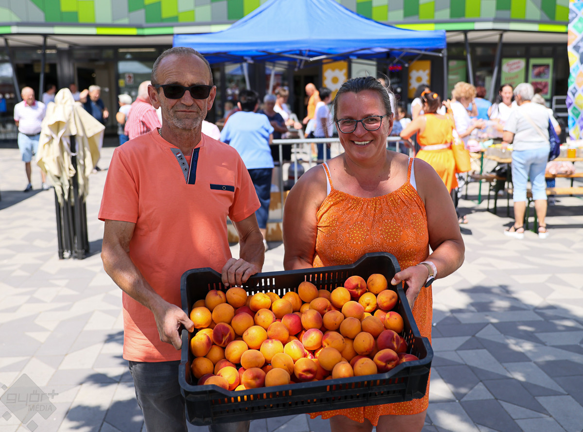 „Minden héten itt vagyok, nagyon szeretek idejönni és nagyon szeretek itt vásárolni, mert nekem csak a magyar áru kell, én azt szeretem. Szeretek eltenni zöldséget, gyümölcsöt, mindent saját kezűleg, pedig 80 éves vagyok. Egy kis dzsemet főzök most a barackból. Nagyon örülök ennek a jótékonysági rendezvénynek, jó dolognak tartom és majd akarok is adni az alapítványnak, a gyermekek javára. Megérdemlik a gyerekek, őket nagyon szeretem, ők a mindeneim”- számolt be a Győr+ Médiának Teleki Éva.