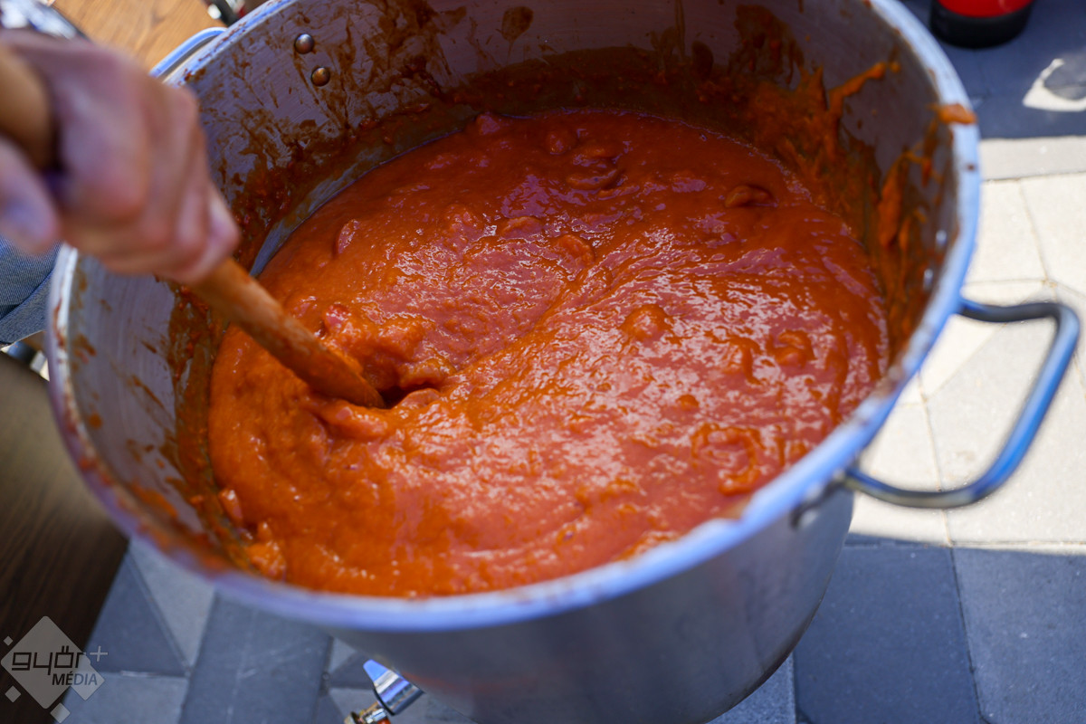 A lekvár alapját, azaz a félbe vágott sárgabarackokat a hatalmas üstökbe rakták és indulhatott is a főzés. “Hagyományos recept alapján dolgozunk, körülbelül 30 kilogrammnyi gyümölcs fért most ebbe, ehhez már csak cukor jön és szeretet, hiszen nem kell hozzá semmi más.”- mesélte Buzásné Kata, aki a 150 kg gyümölcsből nagyjából 150-180 üveg lekvárt remél.