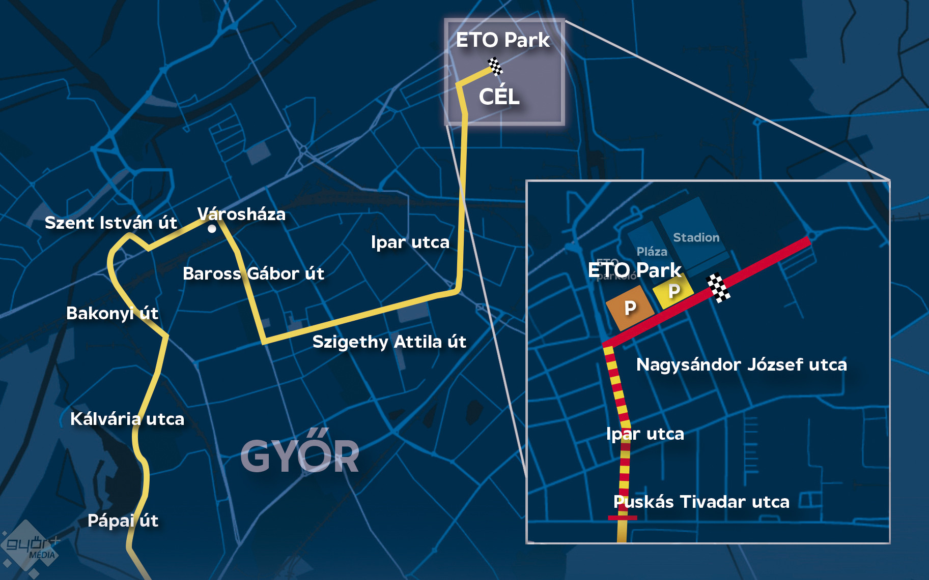A befutószakaszt már május 12-én, hétfőn 18 órától elkezdik kiépíteni, így a Nagysándor József utcában, az Ipar utca és Tóth László utca közötti szakaszon tilos lesz megállni, de aznap 9 órától az ETO Park parkolójának a Nagysándor József utca felé eső oldalát sem lehet használni.