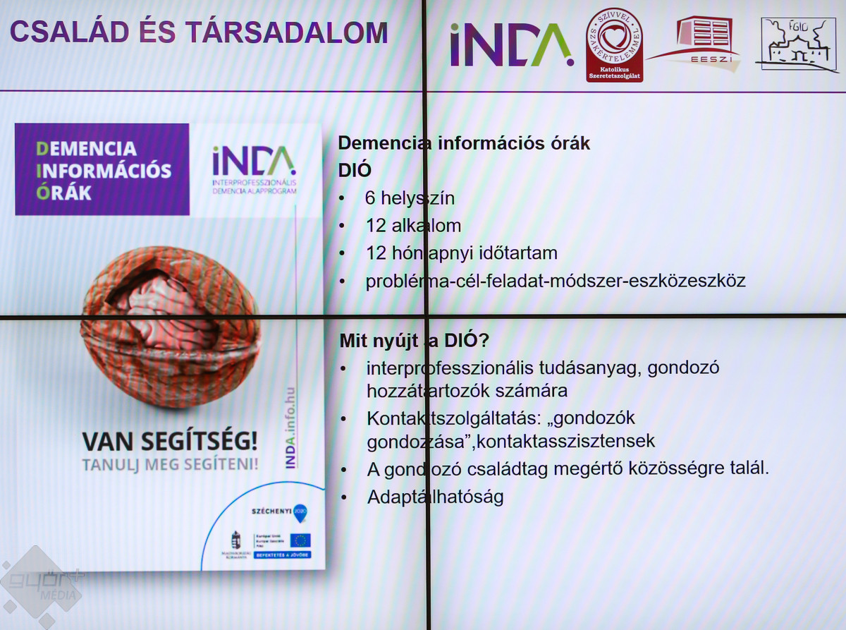 A projekt egyik legfontosabb feladata az volt, hogy rendezvényekkel, kiadványokkal és mentorokkal segítsenek a hozzátartozóknak a demens szép korúak ellátásában. „12 alkalommal az ország hat településén bonyolítottuk le a demencia információs órákat (DIÓ), ami eredményesnek bizonyult. Egy megelőző kutatással, felméréssel és hiteles szakemberekkel dolgoztuk ki ennek a programnak a tematikáját. Újdonságnak számított az is, hogy nem csak frontális előadásokat rendeztünk, hanem személyes mentorok is közreműködtek. Ez utóbbi tette lehetővé azt, hogy a Covid járvány idején is élő maradhasson a kapcsolat.” – emelte ki Dr. Radnainé Dr. Egervári Ágnes szakmai vezető.