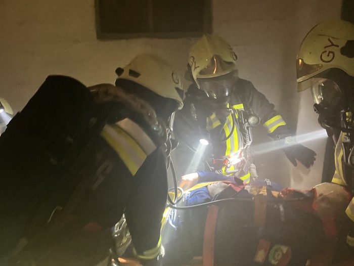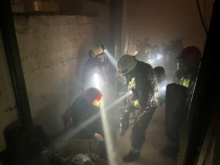 A tűzoltók felkutatták a sérültet a füsttel teli, labirintus-szerű épületben, rögzítették a hordágyon és biztonságos helyre vitték.