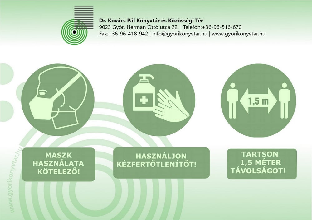 A Dr. Kovács Pál Könyvtár és Közösségi Tér a csütörtöki Kormányinfón elhangzott intézkedéseknek megfelelően módosítja látogatási szabályzatát, amely vonatkozik a könyvtár további programjaira, így a 20. Győri Könyvszalon rendezvényére is.