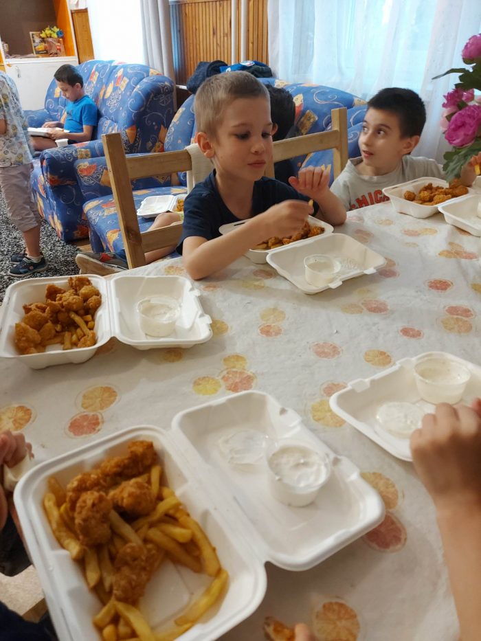 Persze a látogatók nem érkeztek üres kézzel, számos plüssállat, édesség, tisztálkodószer, gyümölcs került nagyon is jó helyre. A kis délutáni sokadalom nem múlhatott el közös üdítőzés és ropizás nélkül sem. Sőt, egy étteremnek köszönhetően még ajándékvacsora is került az otthon lakóinak és dolgozóinak asztalára, akik örömmel falatoztak.
