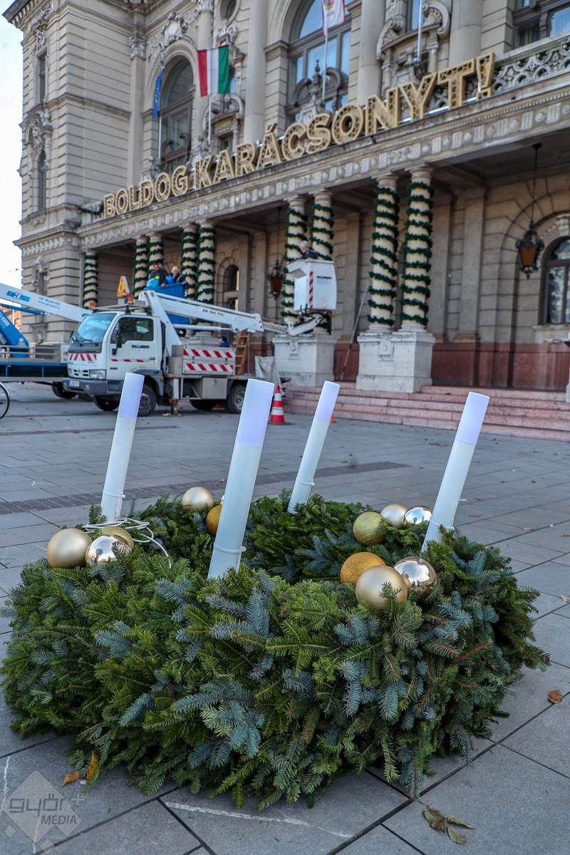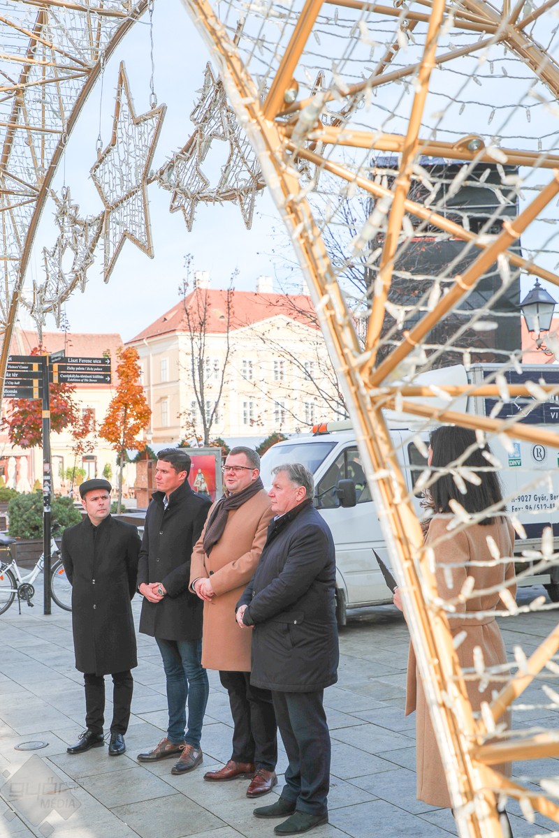 4000 LED-es izzósor, 3500 méter fénykábel, 14 kilométer fényfüzér, 42 karácsonyfa – sorolta a számokat Prédl Antal, a kiépítést koordináló győri útkezelő szervezet vezetője. Kiemelte, idén a már megszokott látványelemekkel találkozhatunk, és a napokban a helyére kerülnek a füzérek, az átfeszítések, valamint a kandeláberdíszek a Városház téren, a Dunakapu téren, a Bécsi kapu téren, a Szent István úton, az Arany János utcában, a Baross Gábor úton, a Baross-hídon, a Czuczor Gergely utcában, a Kisfaludy utcában, a Király utcában, a Kazinczy utcában, a Dr. Kovács Pál utcában, az Aradi Vértanúk útján, a Jedlik Ányos utcában, a Káptalandombon és a Rába-kettős hídon is. Ismét láthatjuk az olyan népszerű elemeket is, mint például a fénykapu, a hóemberek, a beülős fénygömb vagy a szarvas.