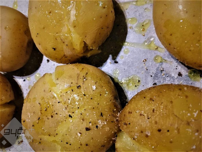 Ezután a sütőt 250 fokra előmelegítem. A főtt krumplikat egy sütőpapíros tepsire teszem, mindegyikre, egyesével rátenyerelek, hogy szétroppanjon. Ezután mindegyiket külön-külön olajjal lecsepegtetem, sózom és frissen borsozom. Mehetnek rá szárított zöldfűszerek vagy fokhagymapor is. Ezután a sütőben 10-12 percig sütöm ropogósra a héját.