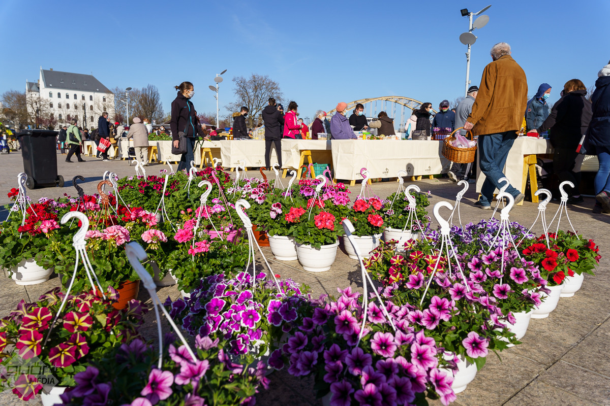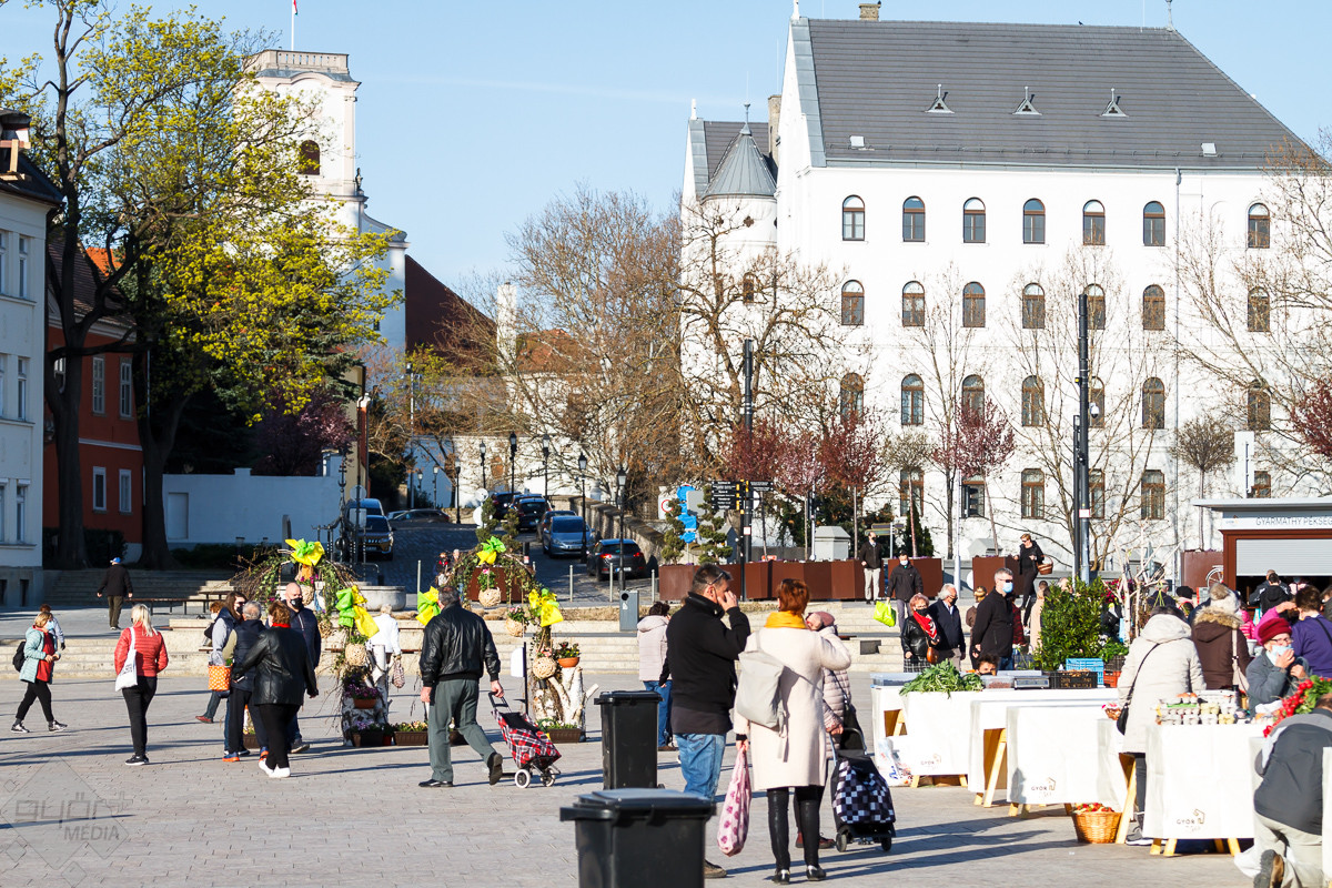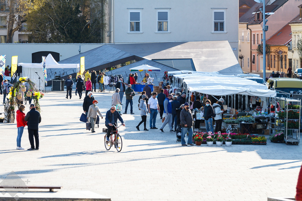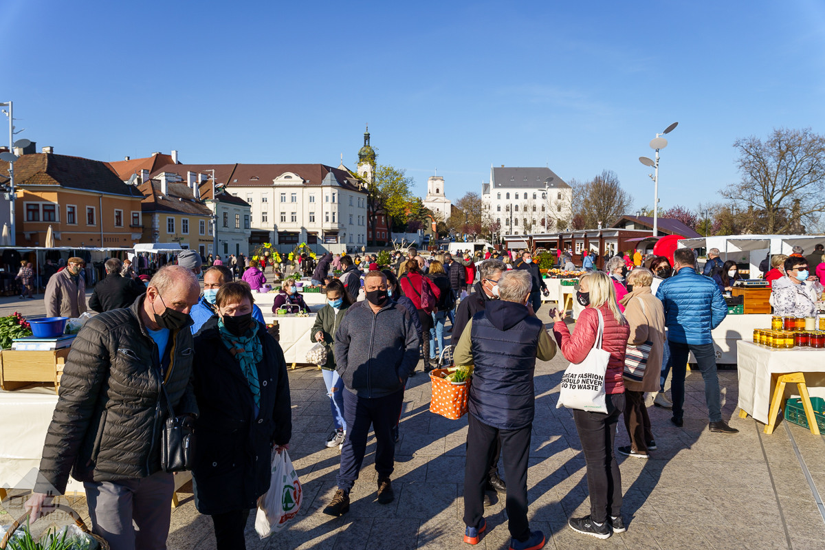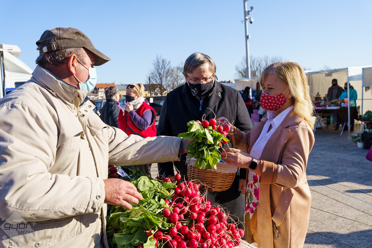 „Öröm látni ezt a sok mosolygós arcot!” – mondta el a Győr+ Rádió helyszíni interjújában Marsovszky Adrien, a városháza belváros fejlesztéséért felelős tanácsadója. És valóban így volt. Árus, vásárló mosolyogva társalgott a tavaszi díszbe öltözött téren. Kínálta magát a harsogóan friss piros retek, a roppanós alma, a szabadföldön termelt újhagyma, répa, zöldség.