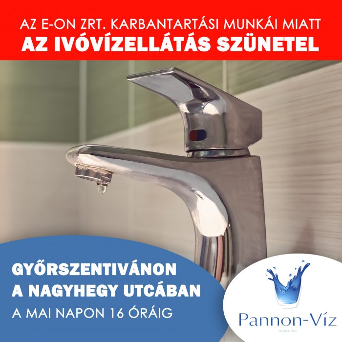 Az E-ON Zrt. karbantartási munkái miatt az ivóvízellátás a mai napon (2023.07.28.) 16 óráig szünetel Győrszentivánon, a Nagyhegy utcában.