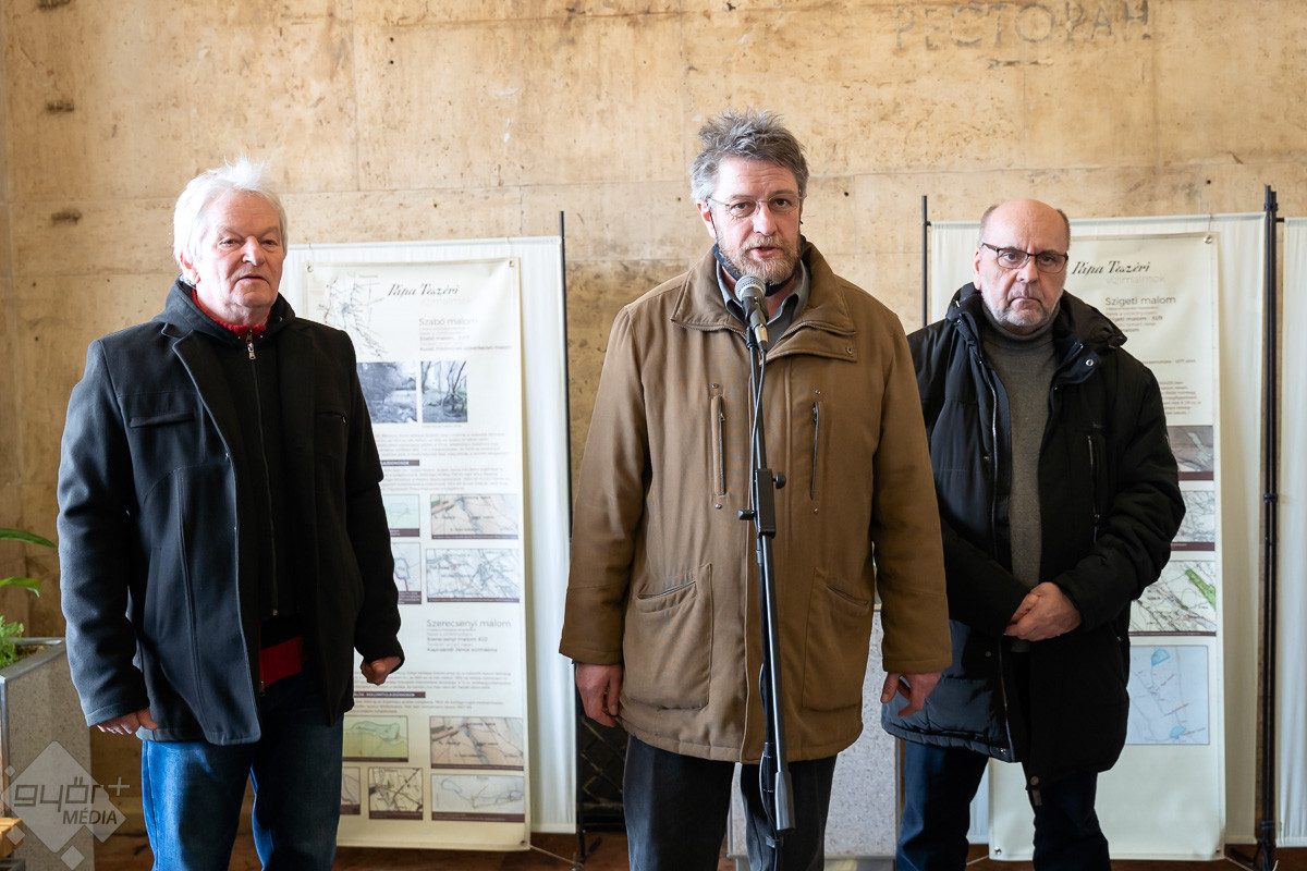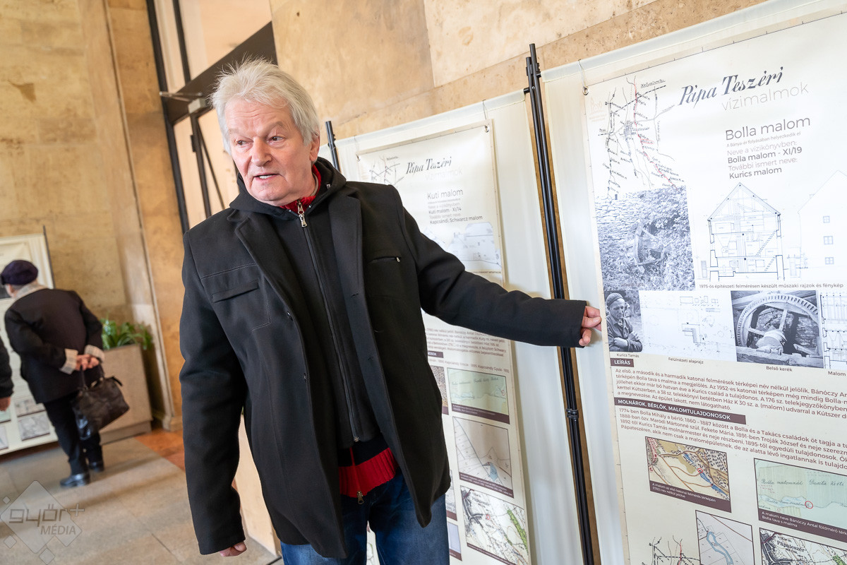 A tárlatot Bana József nyugalmazott levéltárigazgató ajánlotta a megjelent szép számú közönség figyelmébe. Aki a patakmalmok győri vonatkozására hívta fel a figyelmet: a 19. század közepéig a Kisalföld és a Bakonyalja a gabonatermesztésben óriási fontosságú volt, valamint a Bach rendszer végéig Győr volt a közvetítő gabonakereskedelem vidéki központja, ami éppen a vasút kiépítésével hanyatlott le.