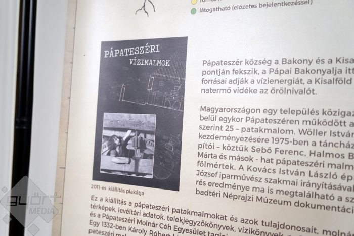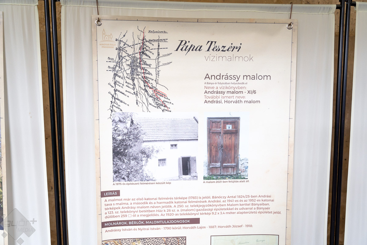 Nagy Péter győri újságíró folytatta a megkezdett felmérését, a kiállítás ezt a kutató munkát tárja a közönség elé. Atárlat a pápateszéri patakmalmokat és azok tulajdonosait, molnárjait mutatja be térképek, levéltári adatok, telekjegyzőkönyvek, vízikönyvek, az 1975-ös építészeti felmérés és a Pápateszéri Molnár Céh Egyesület tagjainak helyszíni bejárásai alapján.