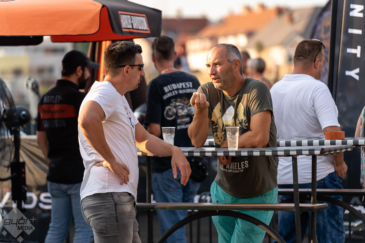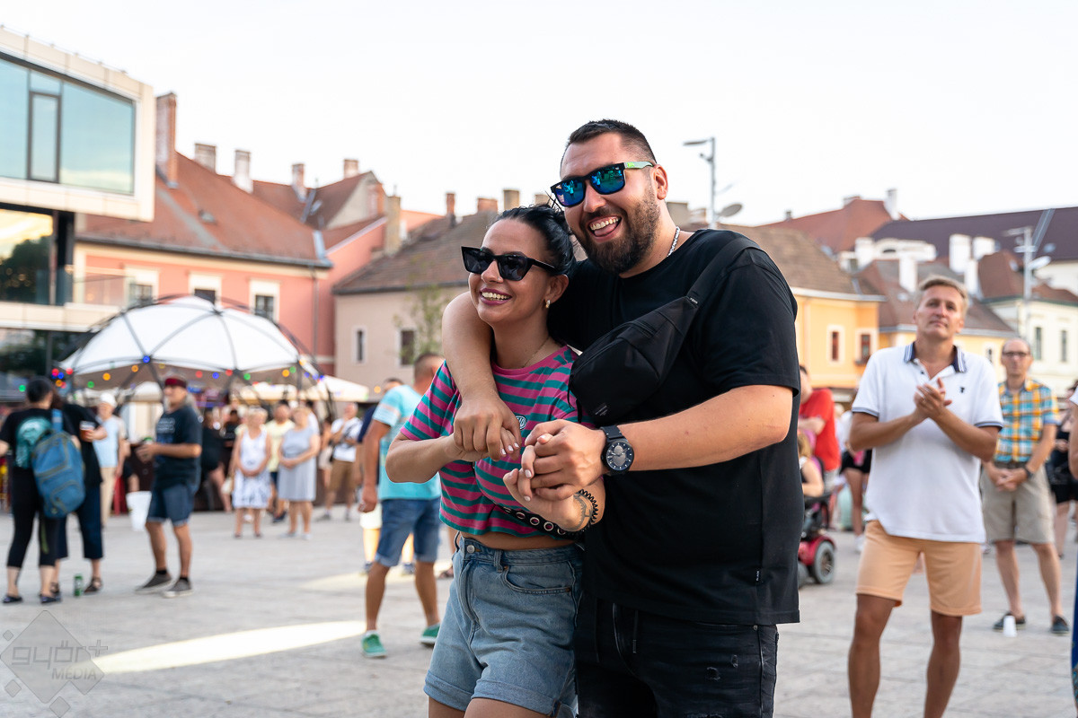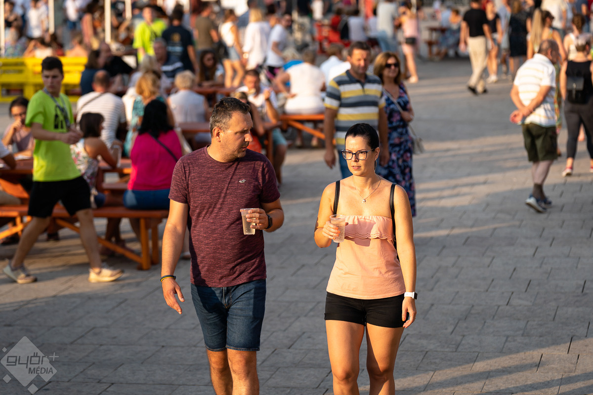Délután egy zápot nyomta le a fülledt meleget, és a néhány percig tartó eső felfrissített a levegőt, ami mindenkinek jót tett. Így színpadon fellépők bátran a húrok közé csaphattak. Elsőként az Elektro Band, majd az LGT emlékzenekar muzsikájára fröccsözhettünk. Az est folyamán fellépett még Rock Milady és a mai koncertek sorát a Győrben is népszerű Hot Jazz Band zárta.