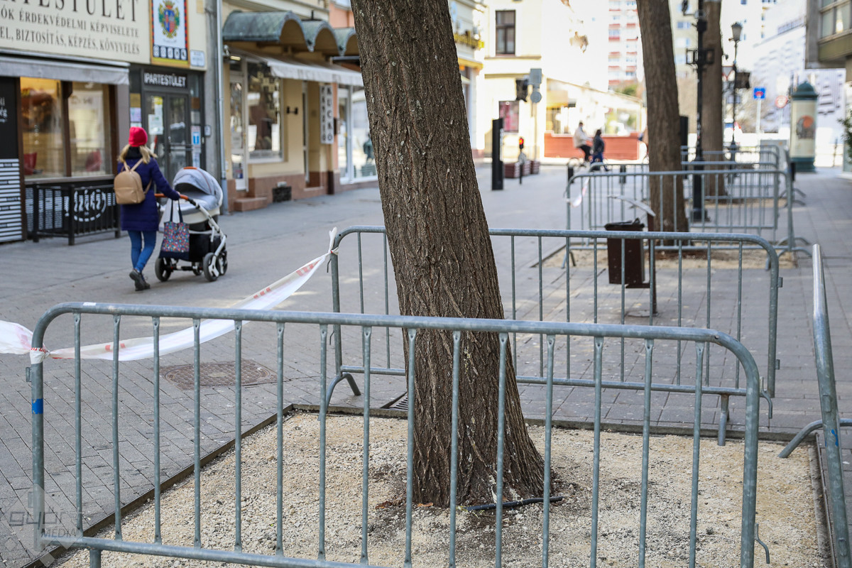 Győr belvárosában az Arany János utca 28-32. szám előtt álló fák tövénél korábban a már máshol jól bevált műgyanta burkolattal biztosították a gyalogos közlekedés zavartalanságát és a gyökérzet védelmét.