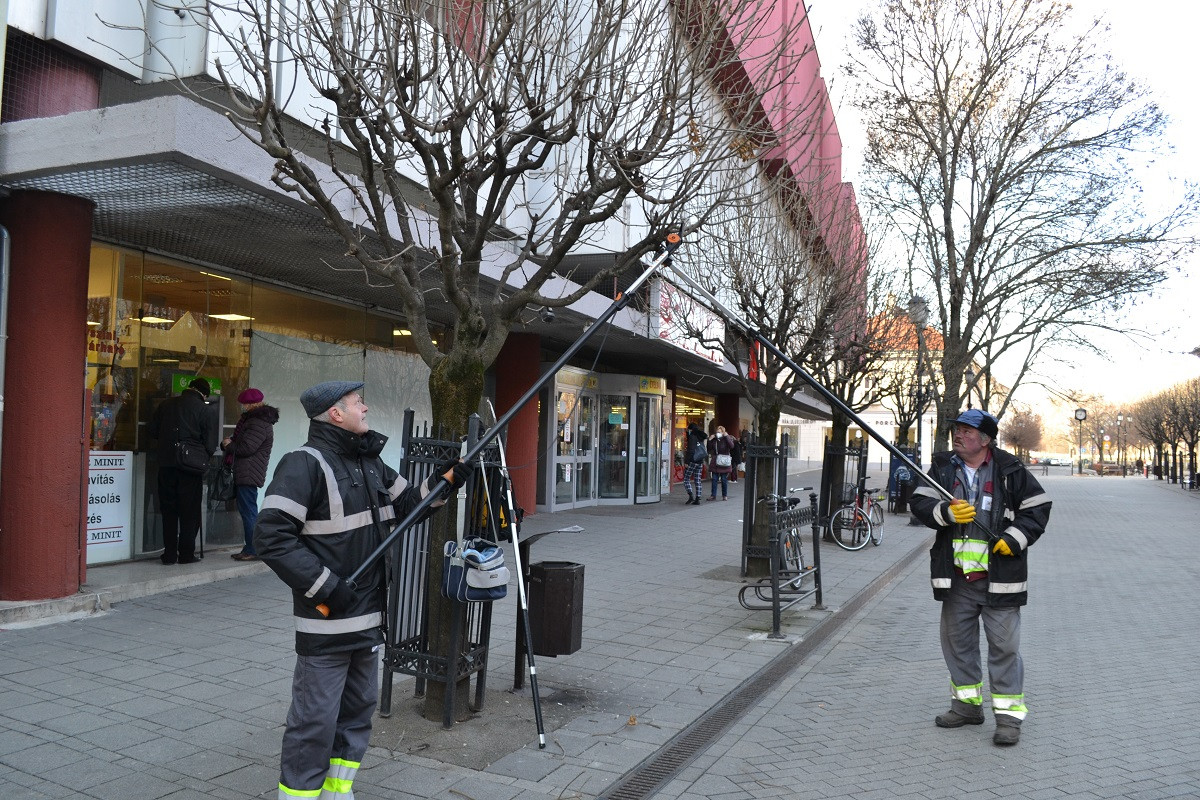 A növények nyugalmi időszakát kihasználva metszik a gömbkőris fákat a belvárosban. Ezeket a fákat nem minden évben kell megmetszeni, a lombkorona rendbetételére csak három-négyévente van szükség.