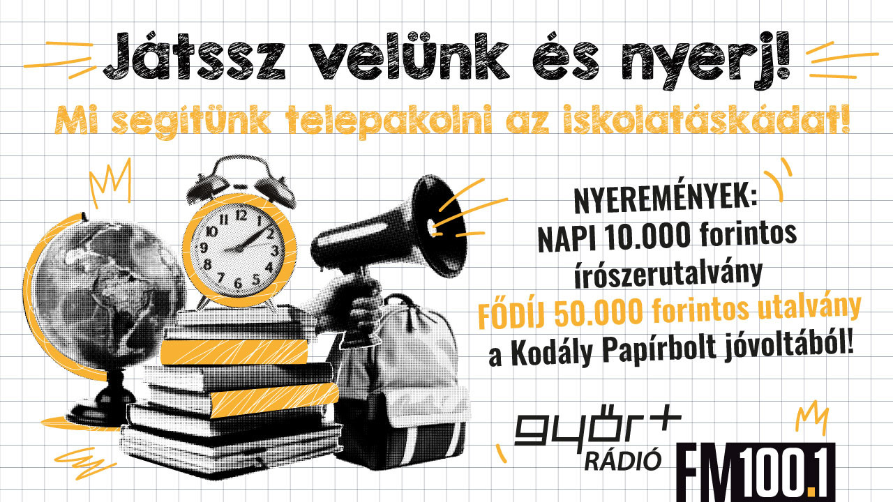 Hallgasd a Győr+ Rádió adását a 100,1 MHz-en, s amint meghallod a játékfelhívó szignált – a becsengetés hangját – küldd el sms-ben vagy viber üzenetben a Győr+ Rádió 06-20-411-7171 telefonszámára, hogy milyen író- vagy tanszer hiányzik még abból a bizonyos iskolatáskából a tanévkezdéshez!