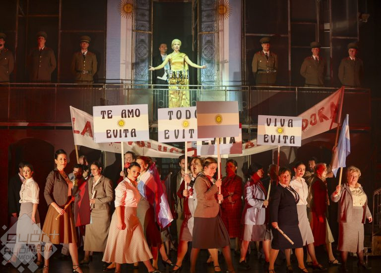 A Kulisszák mögött idei első adásában az évad kiemelt zenés előadásáról volt szó. A Győri Nemzeti Margitszigeti Színházzal közös produkciója a nyári előbemutatót követően decembertől látható a kőszínházban. Eva Perón történetét ugyan nem először mutatják be Győrött, de az új grandiózus produkció, Bakos-Kiss Gábor rendezésében, eddig soha nem látott előadásélményt ígér Gadó Anitával és Horváth Mónikával a címszerepben.