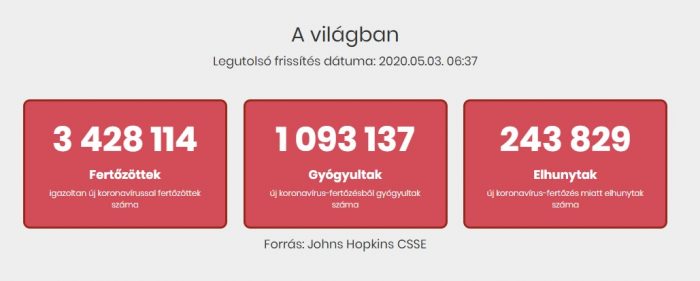 Újabb magyar állampolgároknál mutatták ki az új koronavírus-fertőzést (COVID-19), ezzel 2998 főre nőtt a hazánkban beazonosított fertőzöttek száma. Elhunyt újabb 5 idős krónikus beteg. Ezzel 340 főre emelkedett az elhunytak száma, 629-en pedig már gyógyultan távoztak a kórházból. 1005 koronavírusos beteget ápolnak kórházban, közülük 51-en vannak lélegeztetőgépen. A betegek számának növekedése miatt a kórházak felkészültek a tömeges megbetegedések fázisára és növelték ágykapacitásaikat.