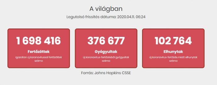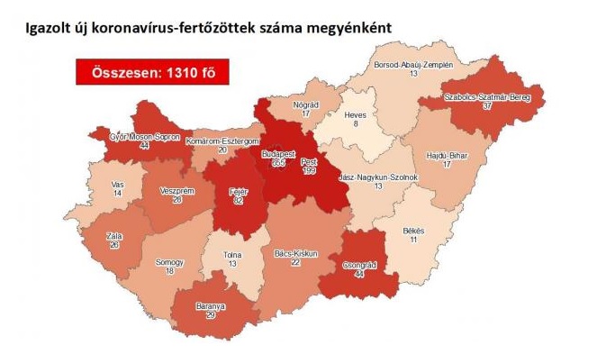 Újabb magyar állampolgároknál mutatták ki az új koronavírus-fertőzést (COVID-19), ezzel 1310 főre nőtt a hazánkban beazonosított fertőzöttek száma. Elhunyt újabb 8 beteg. Ezzel 85 főre emelkedett az elhunytak száma. 115 fő pedig már gyógyultan távozott a kórházból. A Pesti úti idősek otthonában eddig összesen 198 igazolt koronavírus-fertőzött van.